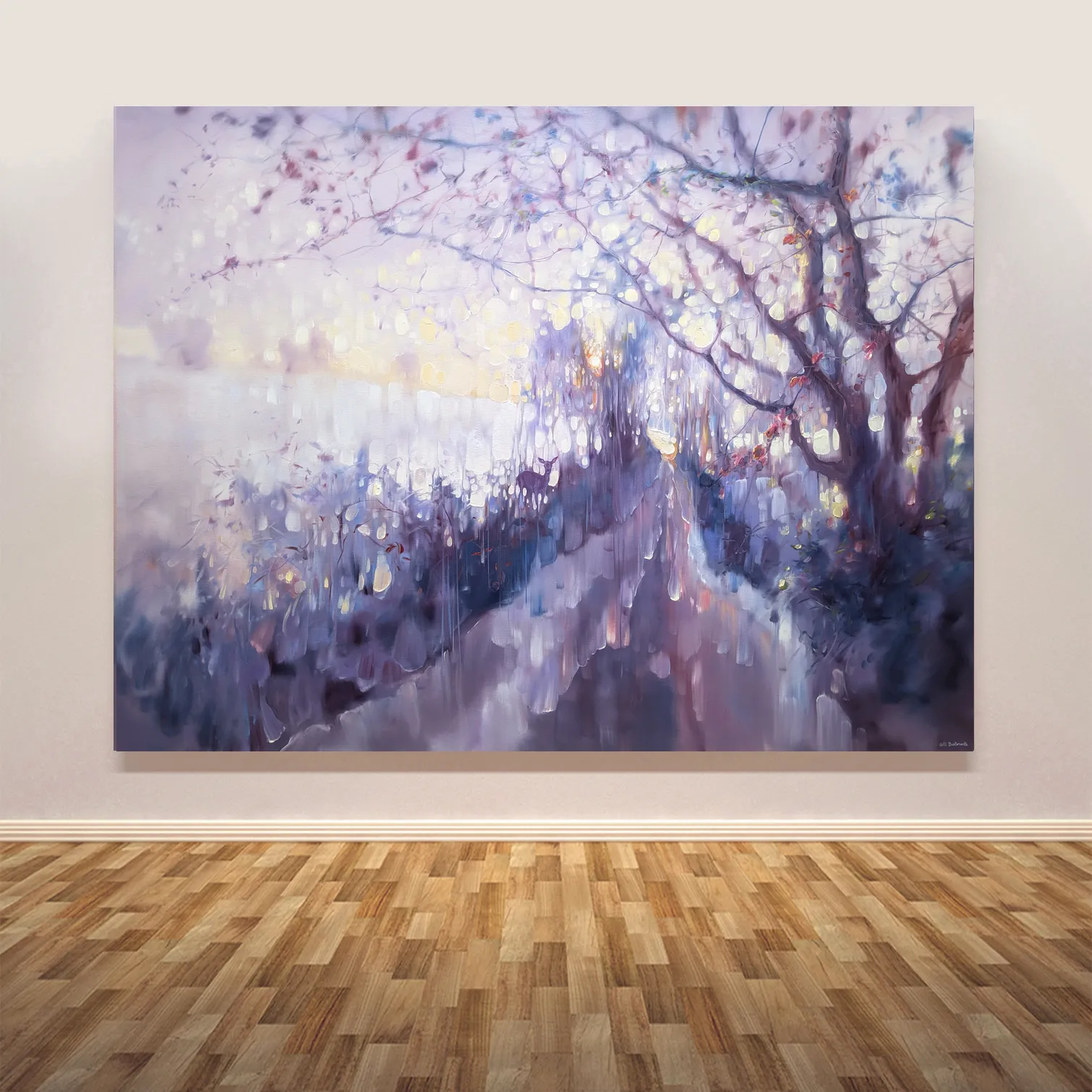The Eldritch Hart is a dreamlike oil painting that blends a semi-abstract forest scene with glowing light and hidden wildlife. A lone deer appears subtly within the luminous textures, evoking mysticism and awe. Gill Bustamante’s use of pastel tones and impressionistic forms creates an ethereal atmosphere full of curiosity and layered meaning. This 48×48 inch statement piece is ideal for expansive, tranquil spaces like living rooms, libraries, or reception areas.