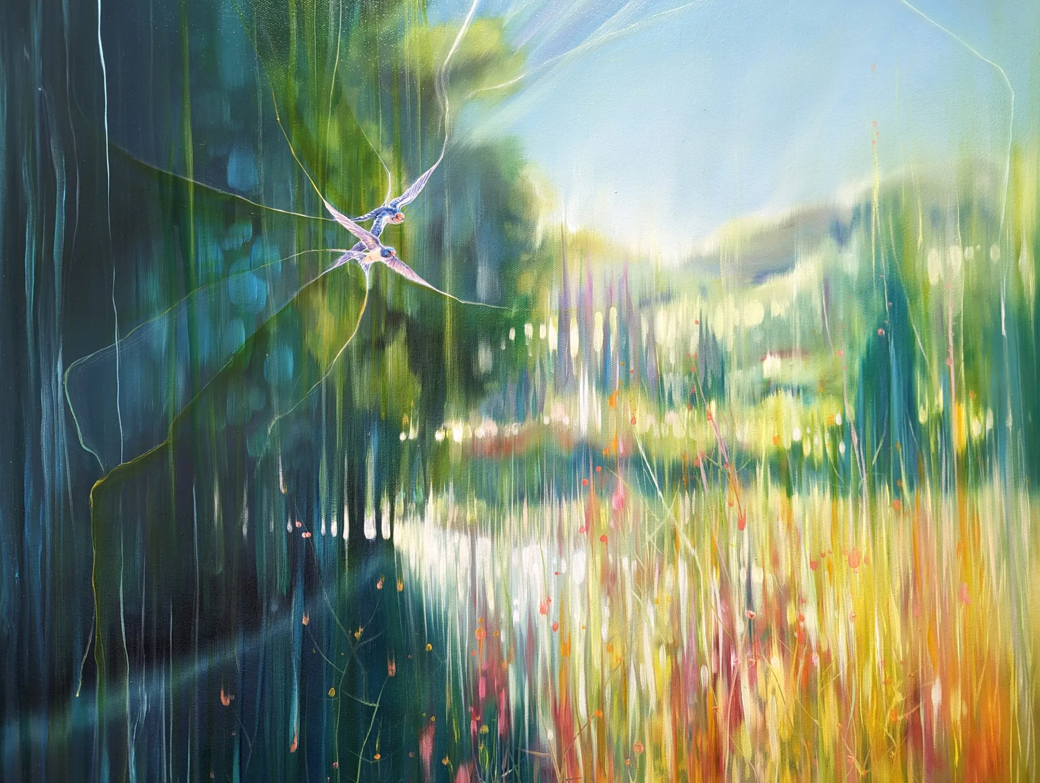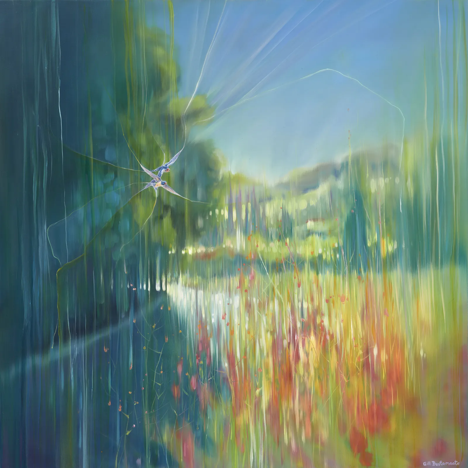The Final Gift of Summer is a vibrant oil painting that captures the essence of nature’s last golden days. Gill Bustamante blends semi-abstract and impressionist techniques to create a lush, colorful landscape filled with light, movement, and emotion. Swallows in flight echo the passing of time, while warm hues of wildflowers and trees evoke joy, nostalgia, and a sense of quiet awe. This 30×30 inch piece is perfect for uplifting interiors like living rooms, lounges, or bright reception areas.