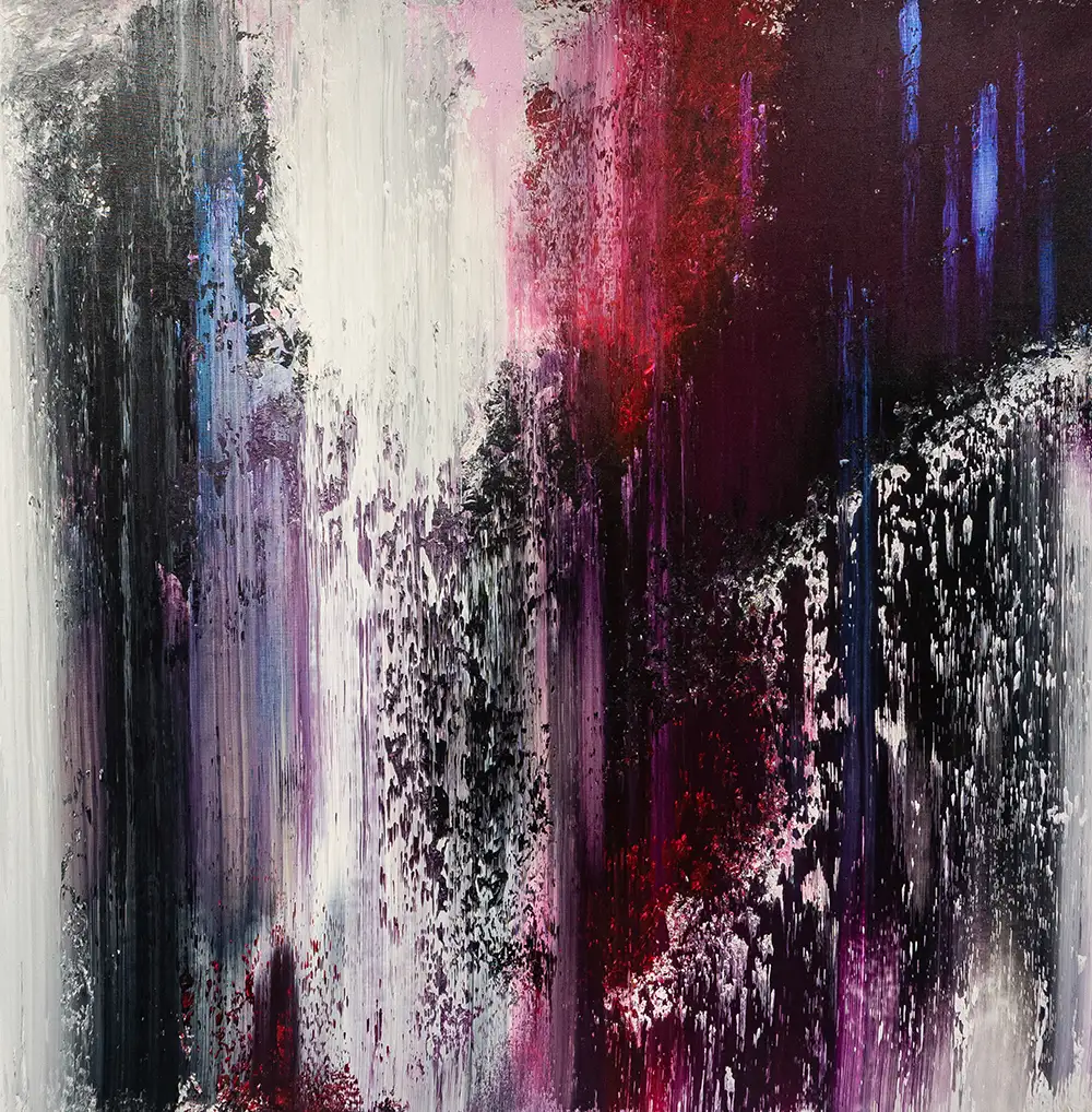 "The Game of Thrones" is a compelling abstract piece dominated by deep purples, stark whites, and rich reds. This painting evokes a sense of majestic power struggles and royal intrigue. The heavy texture and vertical streaks suggest rain on a palace window or the bleeding of regal colors, blending the themes of purity, passion, and power. The moody and sophisticated palette speaks of nobility and the tumultuous nature of dynastic conflicts, carrying an emotional weight that is both reflective and provocative. It could command attention in a foyer or add depth to a lounge's decor.