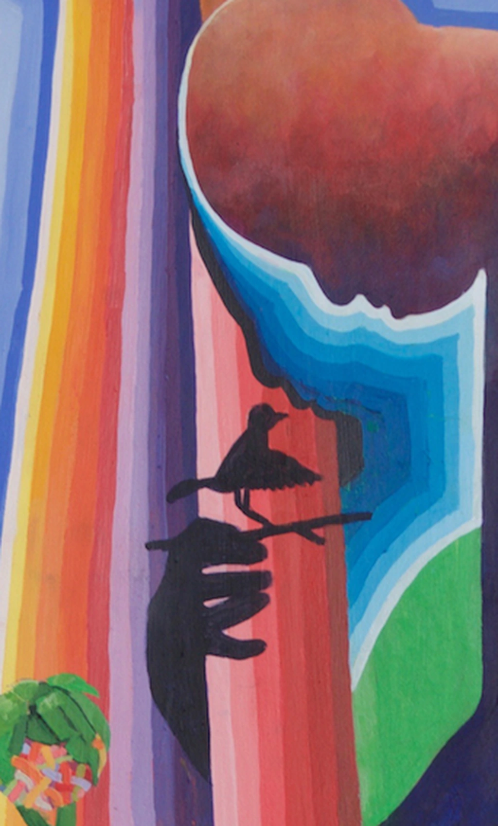 This vibrant work of art blends Expressionism, Surrealism, and Symbolism to explore themes of confinement, growth, and harmony with nature. At the heart of the composition are interconnected human figures immersed in a lush garden teeming with life. The vibrant greens, yellows, and blues bring a sense of vitality, while the symbolic elements of birds, flowers, and trees reflect hope and resilience.