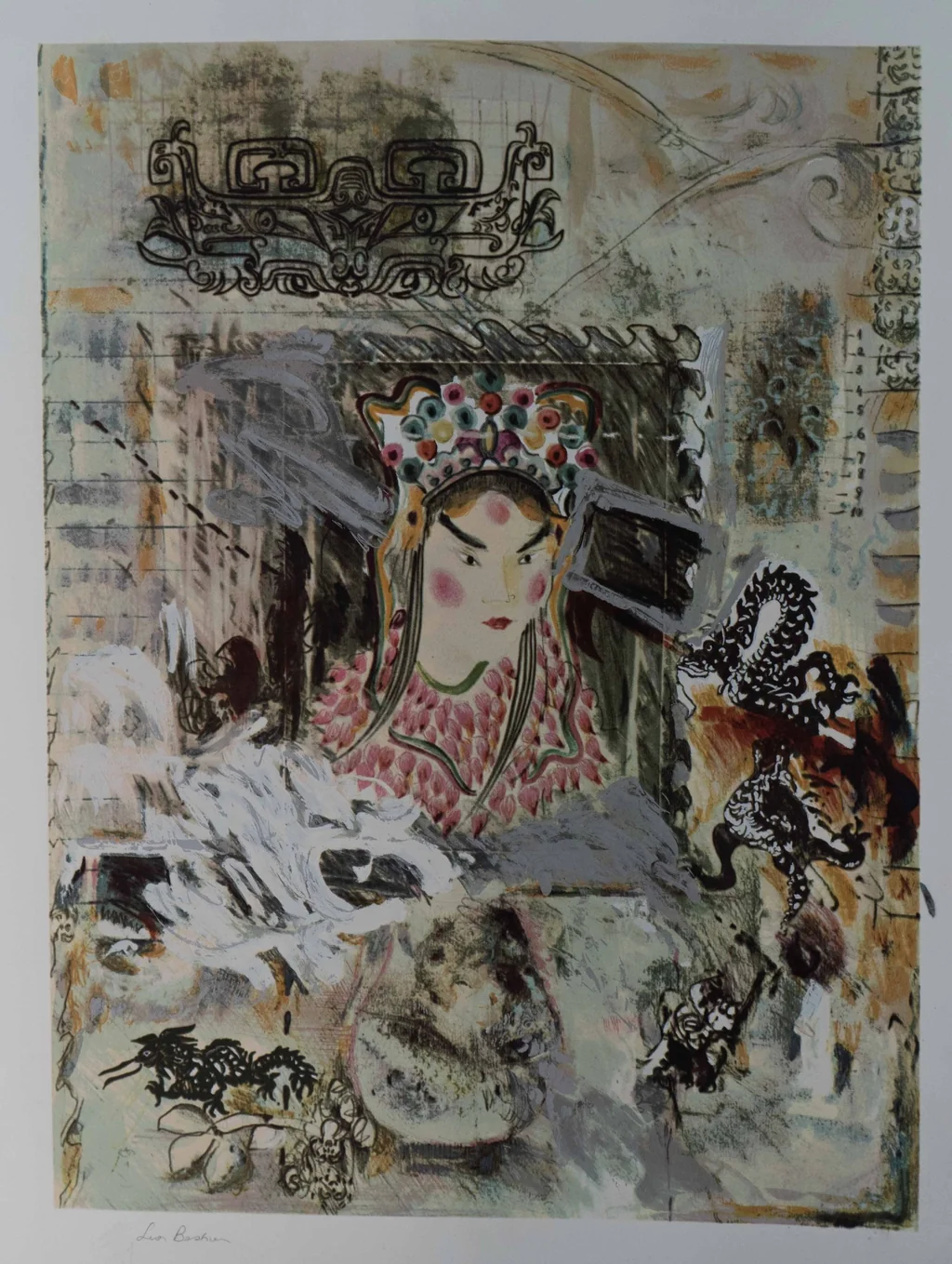 The lithography exudes a whimsical atmosphere, inspiring reflection and awe. The delicacy of the geisha’s features, juxtaposed with the bold dragon motifs, weaves a story of balance and intrigue. These elements highlight Bashan's exceptional skill in merging cultural symbolism with a personal artistic vision.