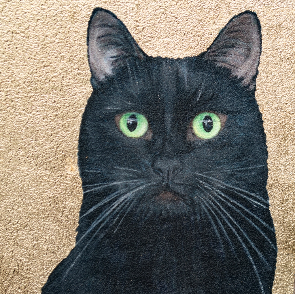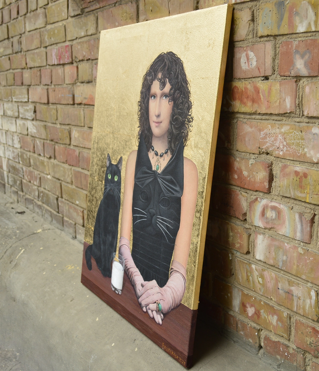 Created in 2023 this 80x60 cm artwork uses artistic texture paste and Amsterdam™ acrylic paints on Unico™ cotton canvas. The painting features a poised woman seated beside a black cat both framed against a rich golden background. The glass of milk on the table introduces an element of simplicity and subtle symbolism inviting the viewer to reflect on the contrasts between refinement and the mundane.