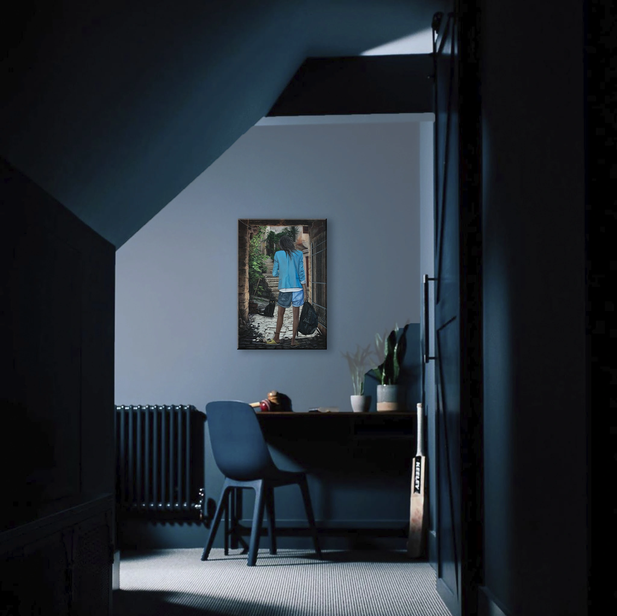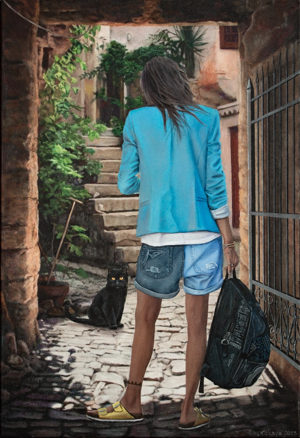 The painting features a lone figure navigating a sunlit cobblestone path framed by earthy brown tones and lush greenery. Dressed in vibrant blue and casual attire, the subject exudes a sense of curiosity and adventure, accentuated by the subtle presence of a watchful black cat. The interplay of light and shadow on the ancient walls highlights the charm of the urban environment while inviting the viewer into a moment of quiet discovery.