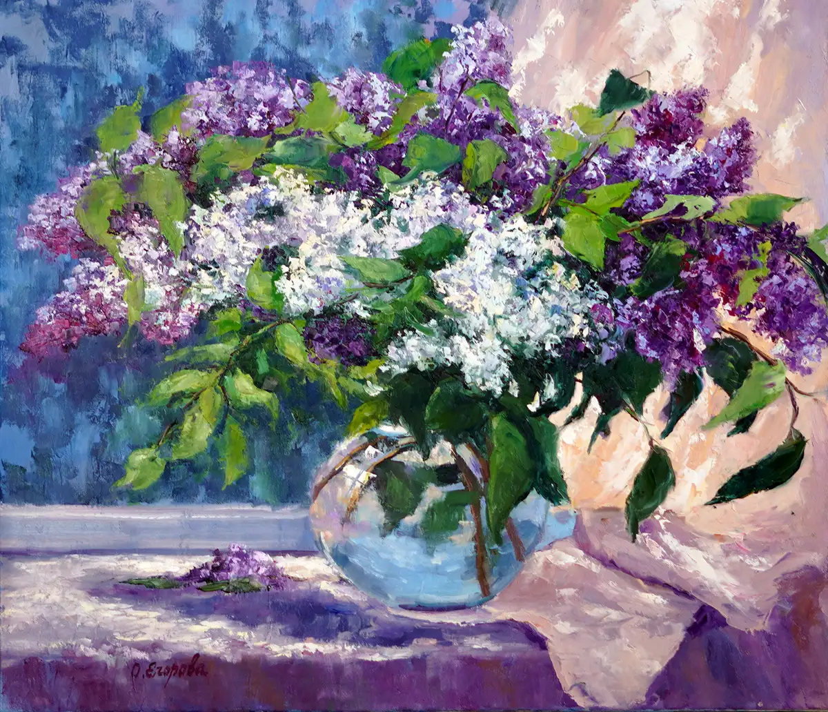 "The Lilac" is a testament to Olga Egorov deep appreciation for the natural world, encapsulating the spirit of spring with robust textures and lively colors. The painting's vibrant purples and soothing whites, set against a cool blue backdrop, convey the freshness of the season and the fragrant allure of the flowers. Egorov’s brushstrokes imbue the lilacs with a dynamic sense of growth and vitality. This piece would radiate charm in a space that benefits from a touch of nature’s splendor, such as a sunlit conservatory, a charming bed and breakfast, or a welcoming sitting area.