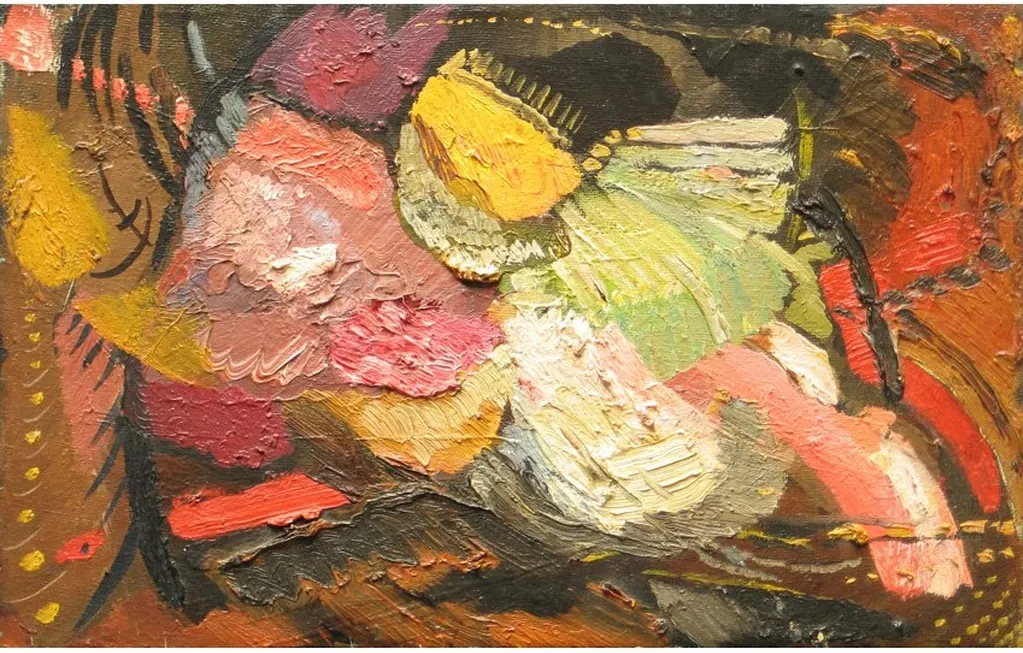 With a rich palette of warm ochres, deep browns, and burnt sienna, the composition is punctuated by bold splashes of pink, red, and yellow, creating a vivid and expressive interplay of color. The textured brushstrokes and layered paint add depth, inviting the viewer to explore the movement and rhythm within the piece.