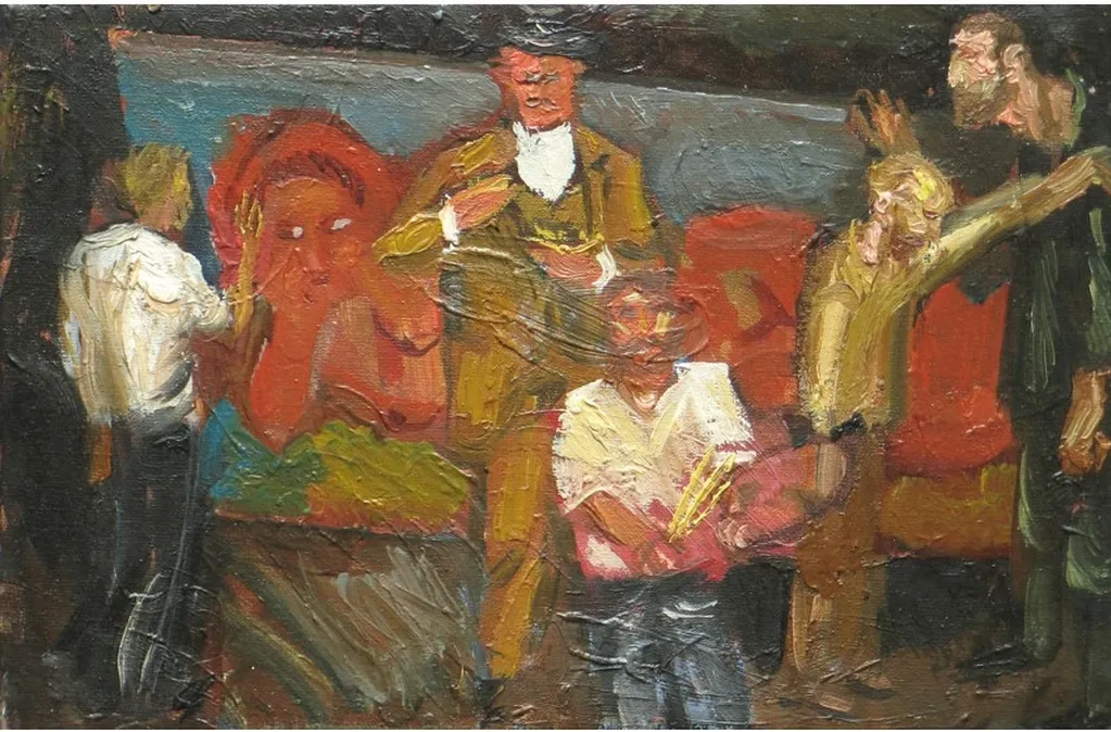 Repka’s thick, textured brushstrokes and dynamic composition bring tension and movement, making the artwork feel alive. The expressive figures, each engaged in a unique stance or gesture, evoke intrigue and invite viewers to interpret the unfolding story.