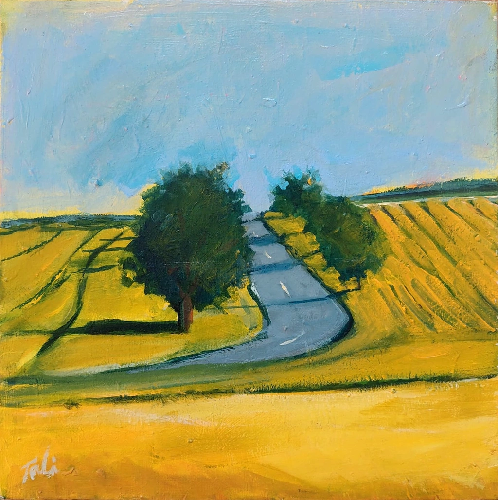 Discover the Sunny Charm of The Road on the Hill by Tali Farhi. A delightful acrylic painting that captures the beauty of a countryside road surrounded by vibrant fields.