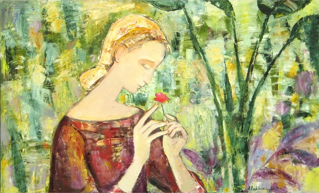 Bakhina’s use of warm reds, deep greens, and golden hues creates a delicate balance between vibrancy and subtlety, evoking a sense of wonder and connection to nature. The expression of the subject, combined with the flowing textures of the surrounding foliage, enhances the painting’s gentle yet profound energy. Perfect for a bedroom, living room, or art gallery, "The Scarlet Flower" is a captivating addition to any collection, inviting viewers to embrace the beauty of nature and quiet introspection.