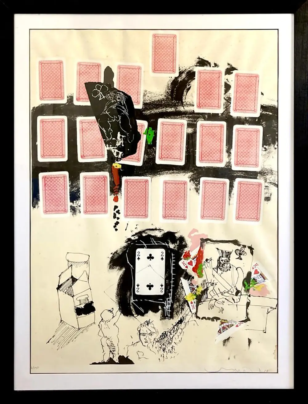 "The Series of Cards" is a limited edition lithograph by Uri Lifshitz, measuring 130x100 cm. Personally signed by the artist, this piece exemplifies Lifshitz's groundbreaking style, blending figurative elements with abstract forms. The composition is dominated by playing cards, with the repetitive pattern disrupted by dynamic brushstrokes and intricate drawings. The bold use of black, red, and splashes of green and yellow creates a striking visual impact. Lifshitz's postmodern approach is evident in the juxtaposition of various elements, reflecting themes of chance and order. The artwork's dynamic and thought-provoking atmosphere makes it an ideal addition to contemporary spaces, offices, or art collections, where it can serve as a conversation starter and focal point.