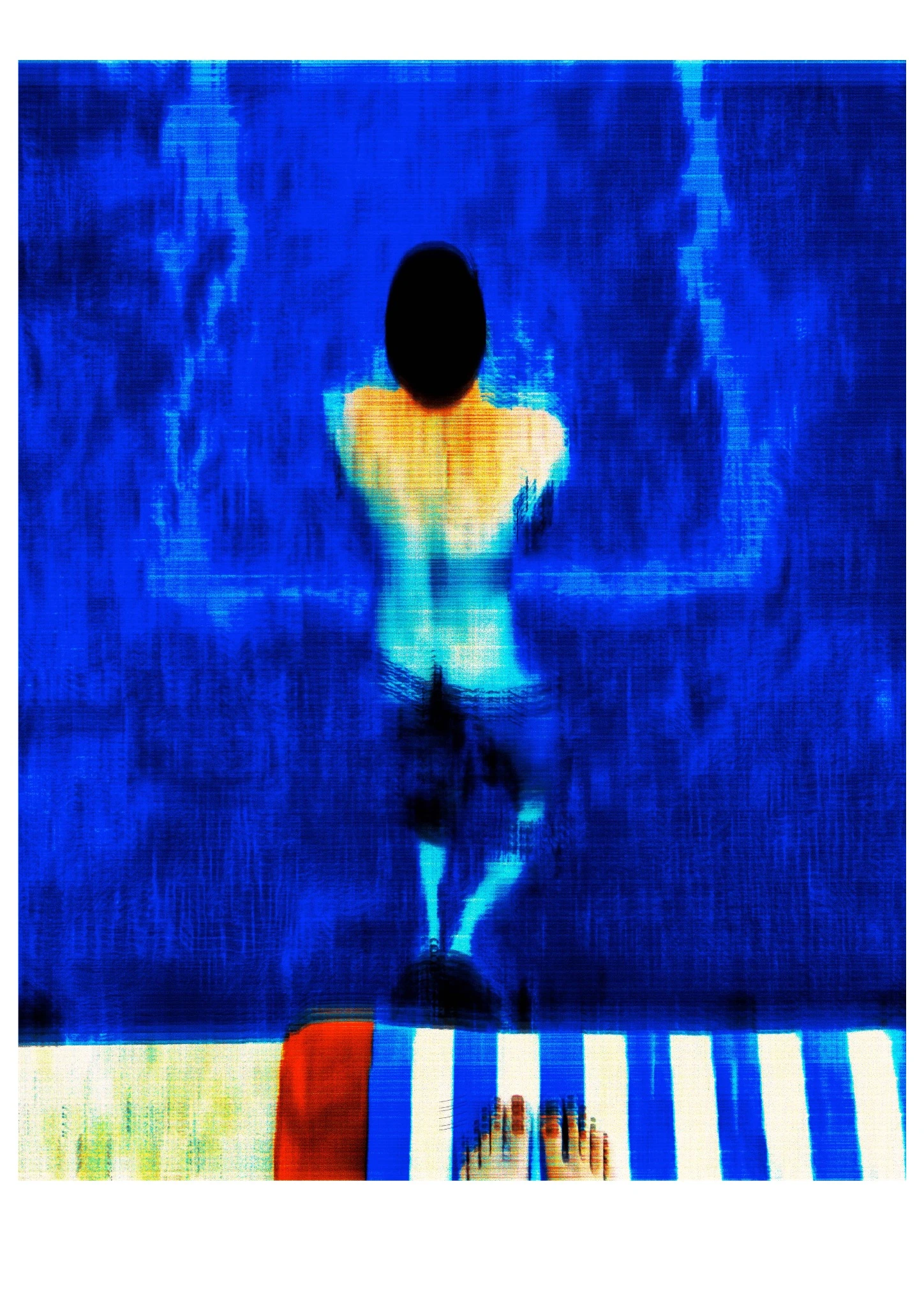 This piece, created using a mix technique on traditional mould-made watercolor paper, features dominant blue tones interspersed with vivid orange highlights and red accents. The bold perspective of swimmers in the water, paired with Torío’s digital artistry, offers a meditative and playful interpretation of an everyday moment.