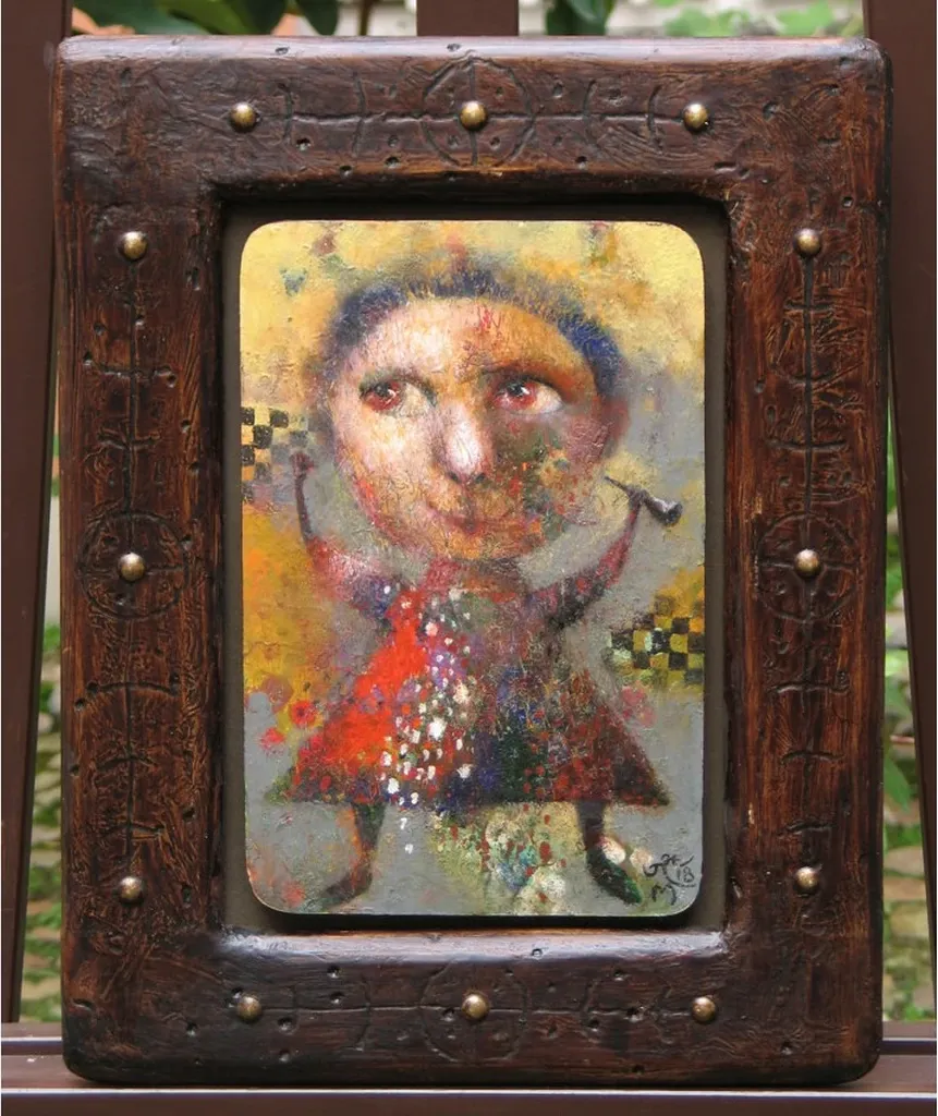 This oil-on-wood painting portrays a whimsical, expressive character surrounded by bold colors and intricate textures. The framed artwork, measuring 46 x 36 cm, exudes an enigmatic charm, offering a timeless artistic appeal that connects deeply with its audience.