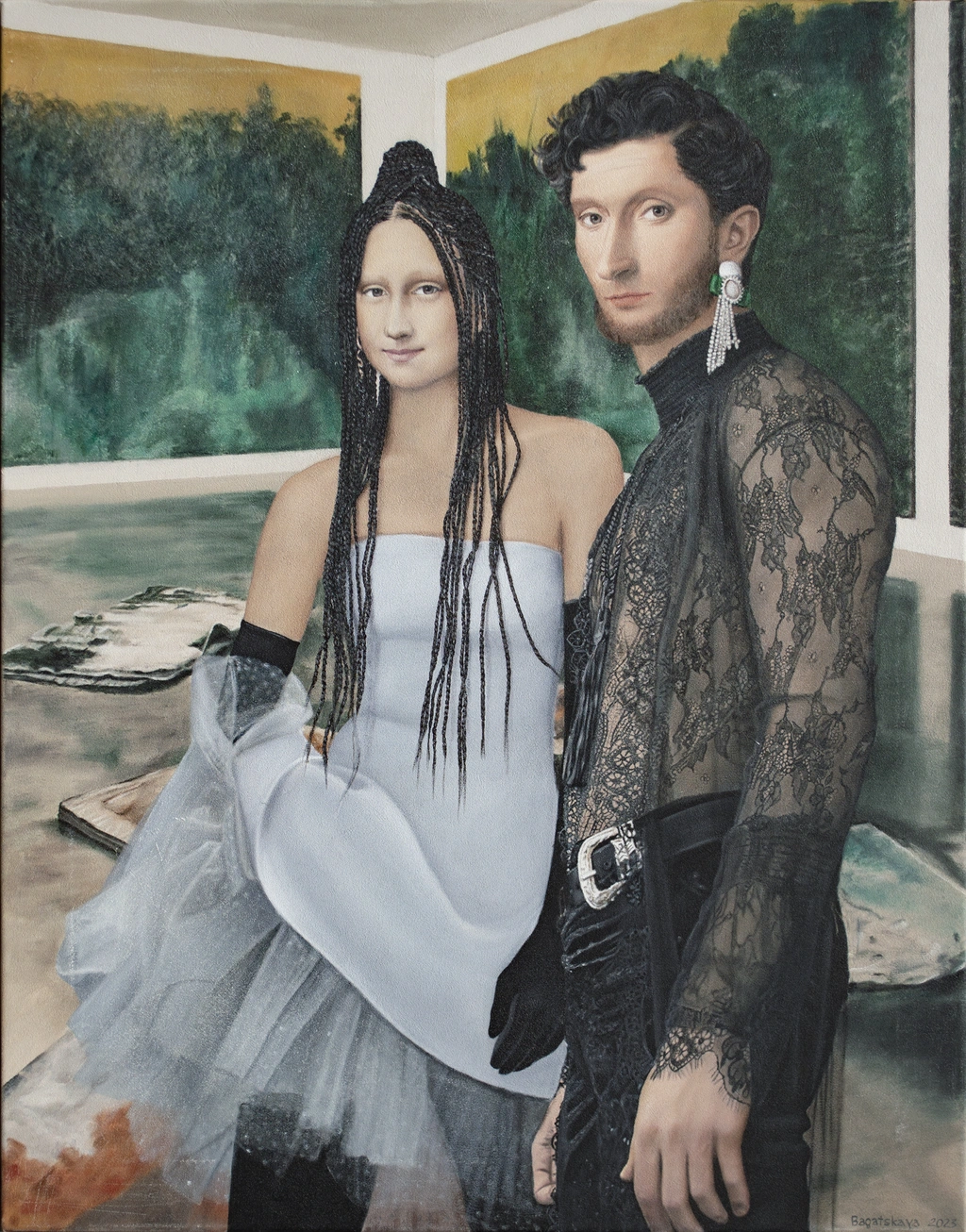 Set against a muted green backdrop with subtle textures, the painting draws the viewer into a refined atmosphere. The delicate interplay of black lace, flowing tulle, and intricate fashion details highlights Bagatskaya's meticulous approach to photorealism, making each figure a celebration of cultural and artistic expression.
