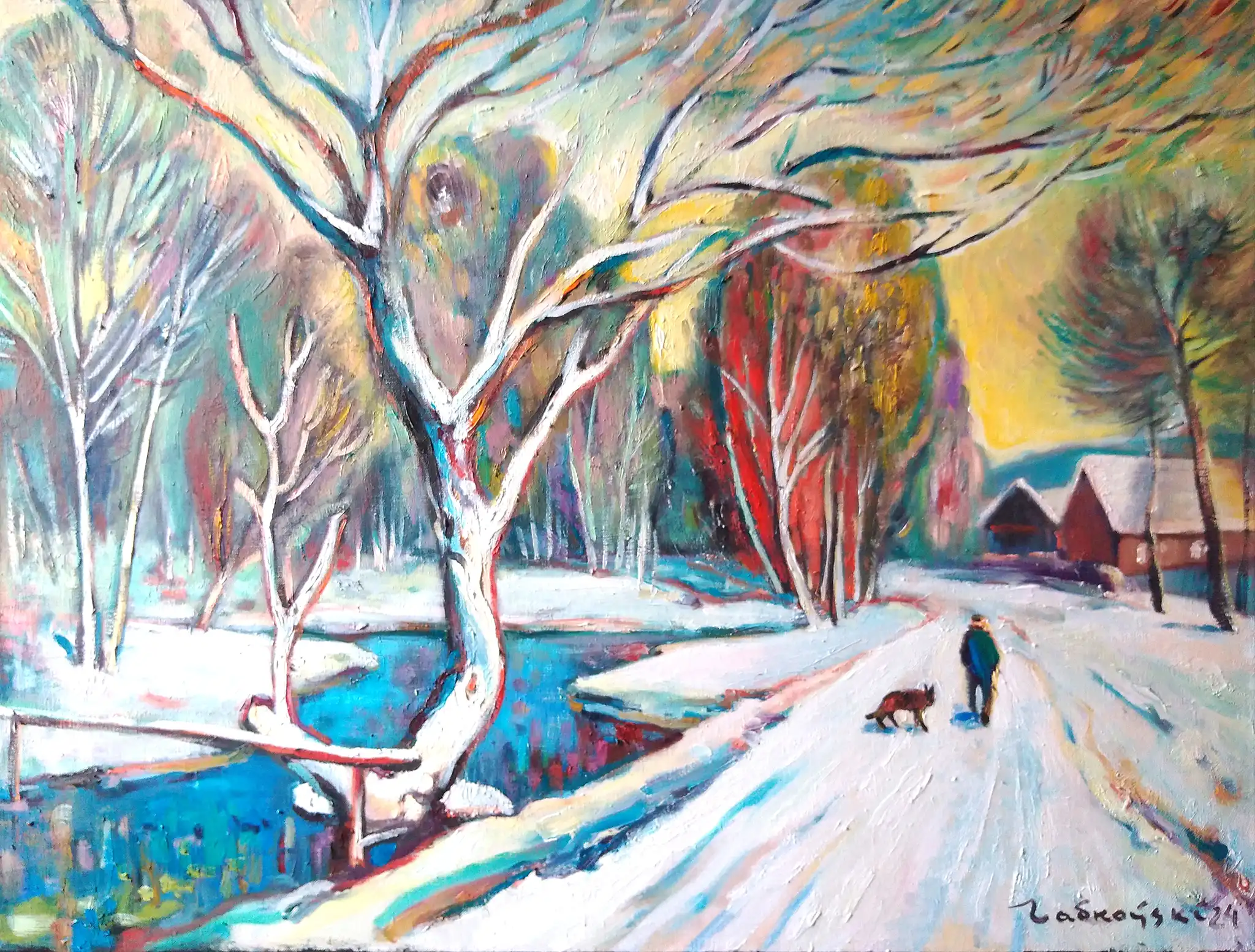 The use of cool tones—blues, greens, and whites—paired with the warm, vibrant accents of red and yellow in the trees and sky, creates a striking contrast that brings the scene to life. Labkouski’s loose brushwork and delicate play of light and shadow evoke a sense of calm and solitude, inviting viewers to immerse themselves in the quiet beauty of a snowy winter's night. The soft, glowing colors of the snow and the tranquil reflections on the icy water enhance the painting’s serene atmosphere, making it feel both peaceful and inviting. The figure and dog, small yet significant, add a human touch that underscores the simplicity and beauty of rural life in winter. Ideal for spaces such as living rooms, studies, or galleries, "The was snow at night" is a perfect piece for those who appreciate the subtle beauty of seasonal landscapes. Its calming and reflective qualities make it a wonderful addition to any space, celebrating the quiet, understated charm of winter.