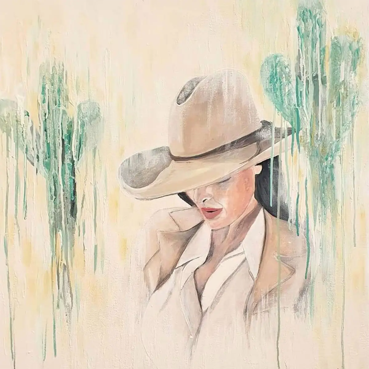 "The Wild West" eloquently captures a solitary figure, evoking the quiet dignity and reflective mood of a bygone era. The subdued earth tones and soft textures suggest the vast and open landscapes of the American West. The figure's downward gaze and the broad brim of the hat casting a shadow over her features create a sense of introspection. The painting skillfully balances realism with abstract elements, as seen in the cactus forms melting into the background, giving the piece a dreamlike quality. The artwork invites a feeling of nostalgia and a connection to the wild and free spirit of the West. It would resonate well in an environment that appreciates a blend of modern and rustic aesthetics, such as a living room or an office that favors understated elegance and a sense of history.