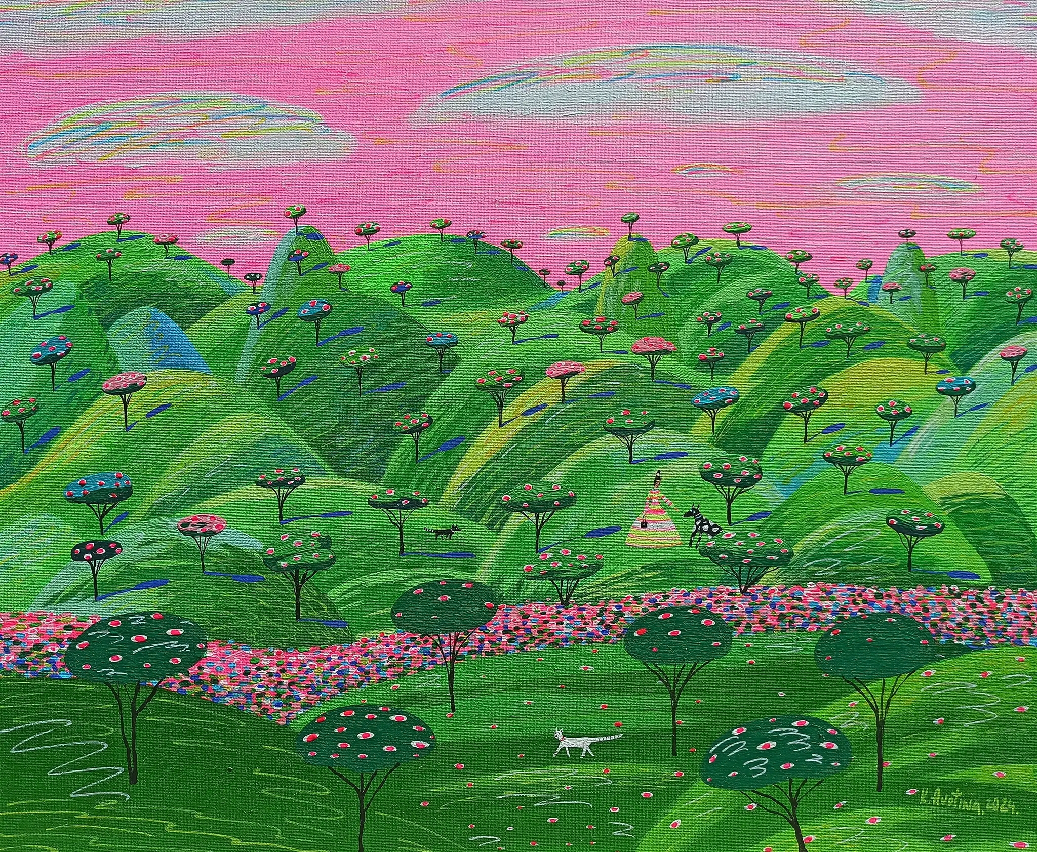 The simplicity of the design, combined with the rich palette of pinks, greens, and blues, creates a serene yet uplifting atmosphere. The painting has a playful, almost dreamlike quality, with small details like animals wandering the landscape, adding a sense of discovery. The undulating hills lead the eye across the canvas, evoking a sense of peace and tranquility, making this piece ideal for any room that could use a touch of whimsy and natural beauty. With its colorful and lighthearted composition, The World In Blossom is a perfect example of Avotina’s skill at merging joy and nature into her work, drawing influence from both her Latvian heritage and the beautiful landscapes she encounters during her travels.