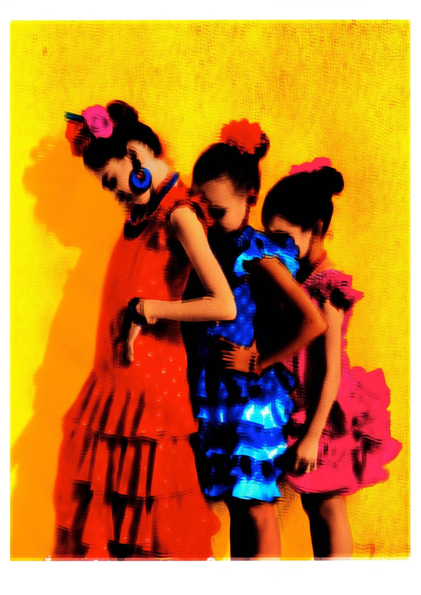 The painting portrays three Flamenco dancers adorned in vivid red, blue, and pink dresses, set against a striking yellow backdrop. Using a mix technique on traditional mould-made watercolor paper, Torío infuses the composition with festive energy and harmonious elegance.