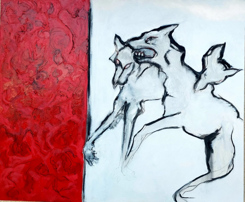 With a dominant red background juxtaposed with stark monochrome figures, this Expressionist work is filled with tension and mystery. The intricate details and dramatic composition make it an ideal centerpiece for art galleries or modern spaces. Boaz Miller is renowned for pushing boundaries through his figurative works, which delve into form, texture, and narrative. Three Wolves invites the viewer into a realm of power, transformation, and symbolism, blending artistry with storytelling.