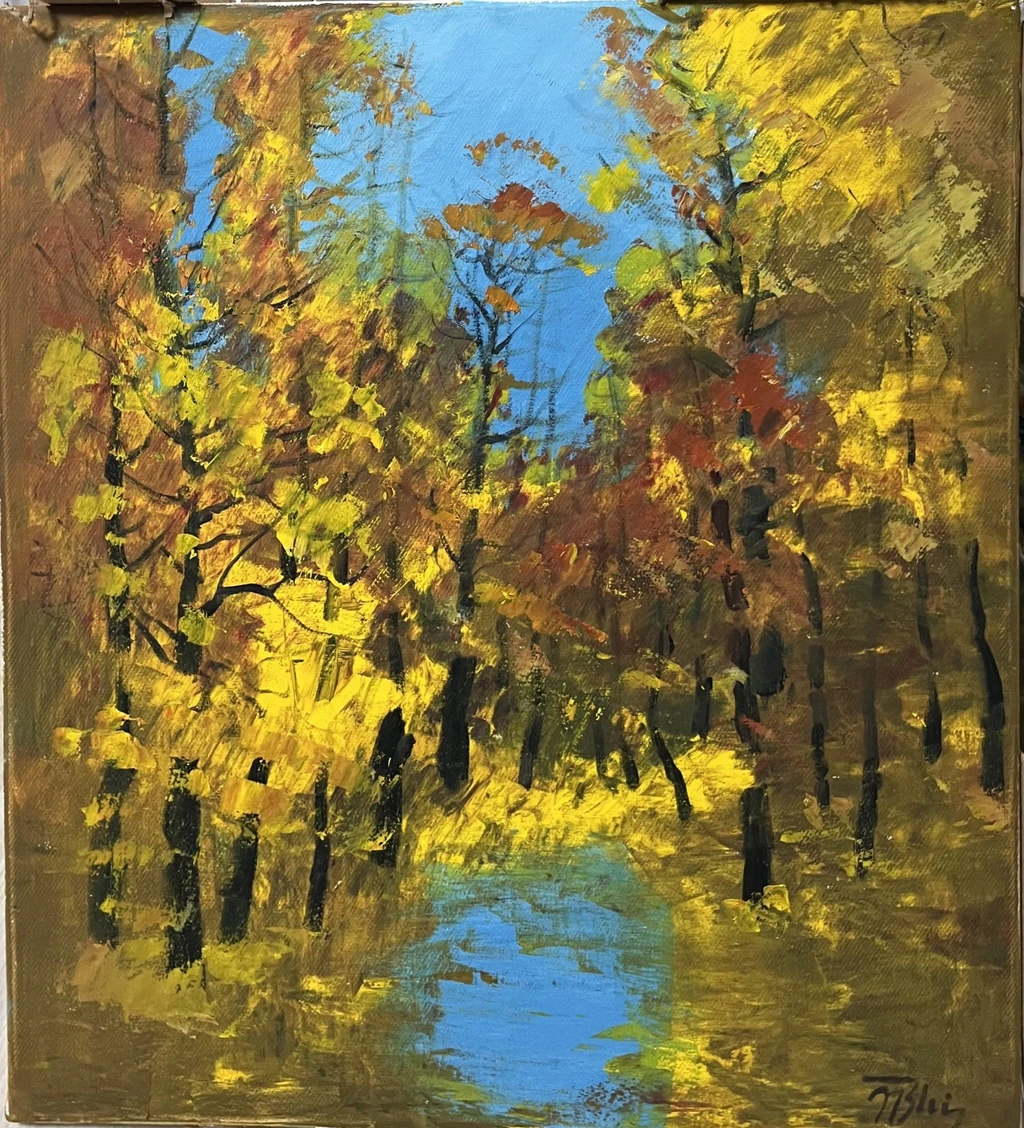The painting portrays a dense forest bathed in golden light, with trees standing tall and their vibrant leaves forming a mesmerizing canopy. A calm stream winds through the landscape, mirroring the sky and adding an element of peaceful movement to the composition. Blei’s signature expressive brushstrokes and textured layers lend a sense of depth, making the viewer feel as if they are walking along this quiet woodland path, surrounded by nature’s autumnal splendor.