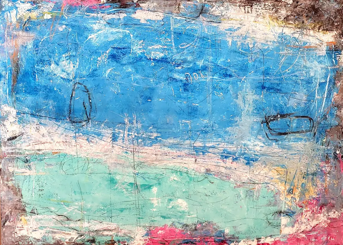 "Tranquil Tides" is an evocative abstract piece measuring 90 x 120 cm. This painting features a soothing blend of blue and green, reminiscent of ocean waves and tranquil waters. The composition is layered with soft brushstrokes and subtle textures, creating a sense of depth and movement. The hints of white and pink add a delicate contrast, enhancing the overall harmony of the piece.