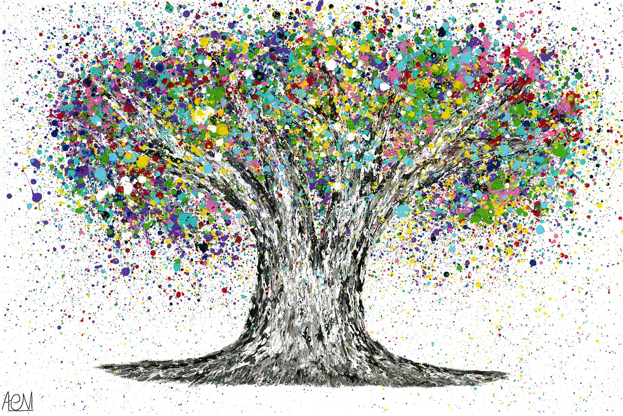 The acrylic medium used in 'Tree Of Life - Colorful Dream' enhances the texture and depth of the artwork, giving it a dynamic and lively appearance. Levi's distinctive splatter technique, reminiscent of Jackson Pollock's abstract expressionism, brings a sense of spontaneity and joy to the piece. The vibrant colors contrast beautifully against the crisp white background, making the tree stand out as a beacon of life and positivity.