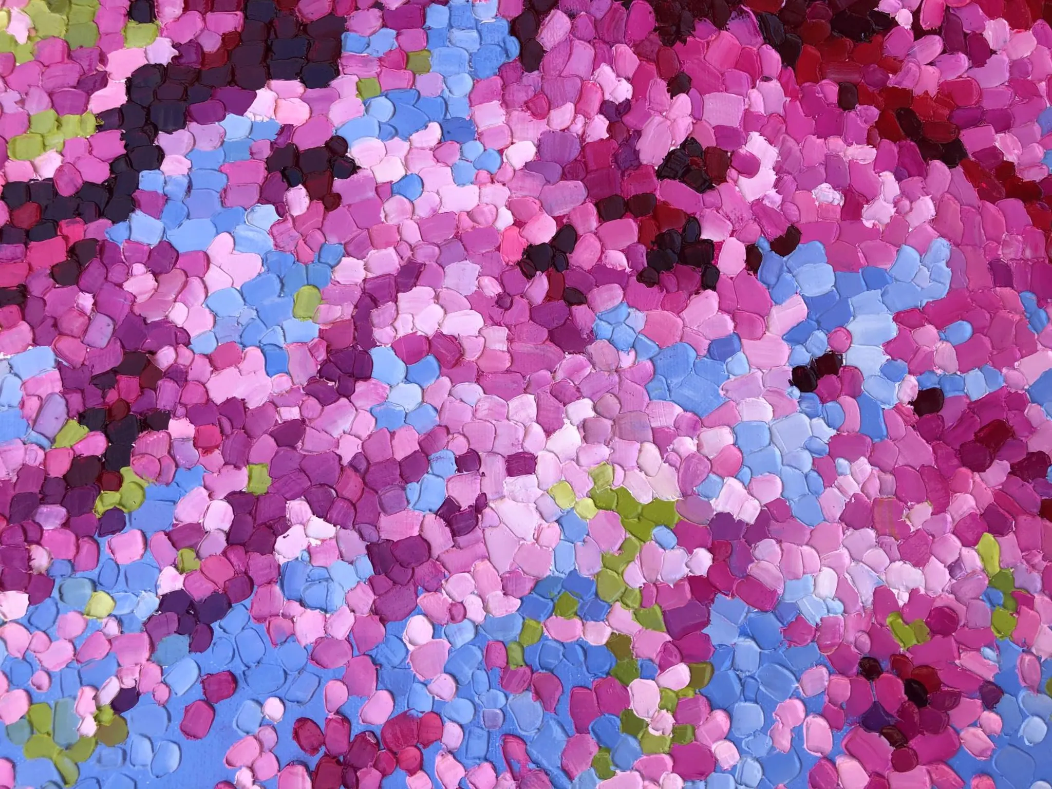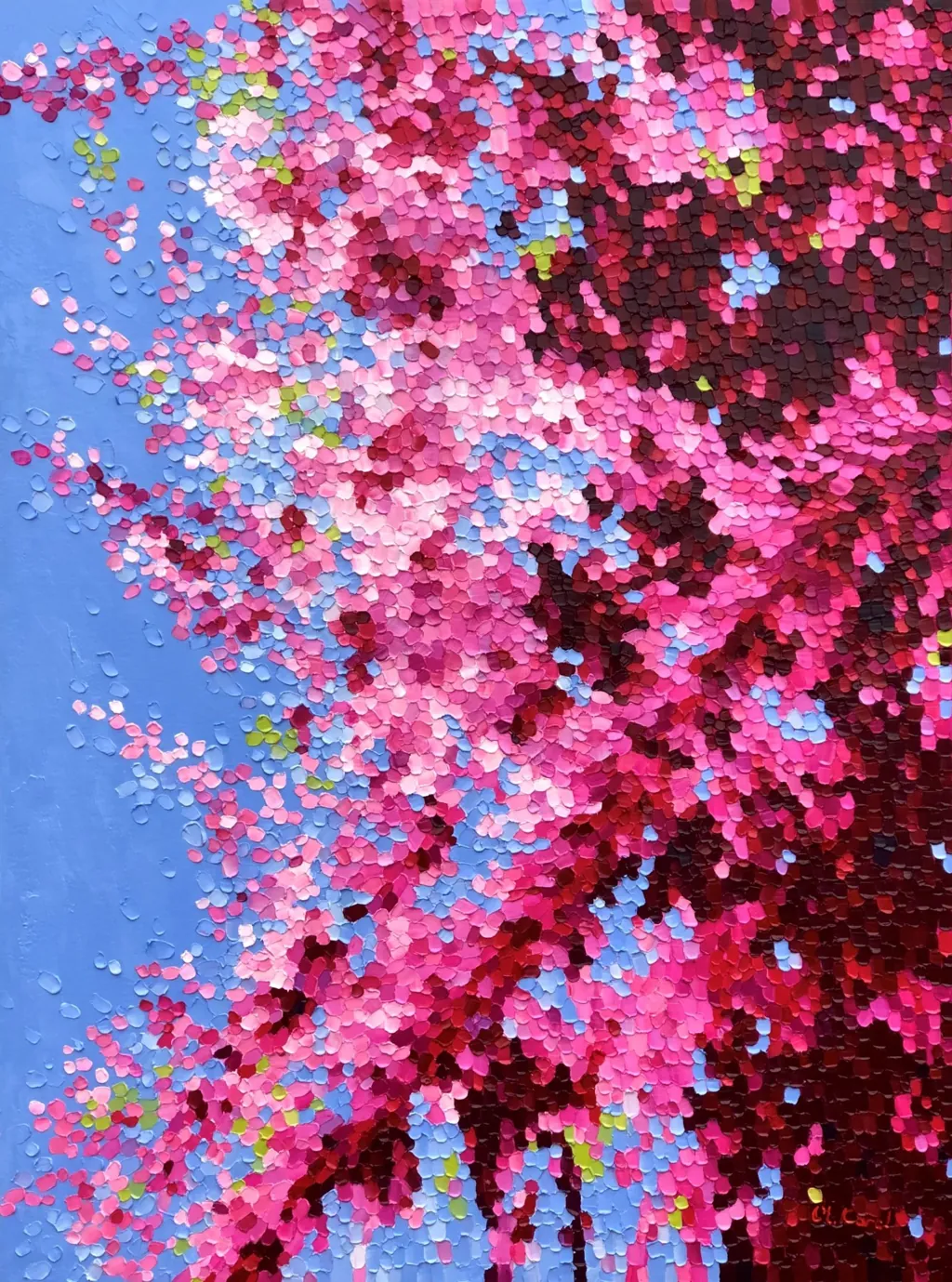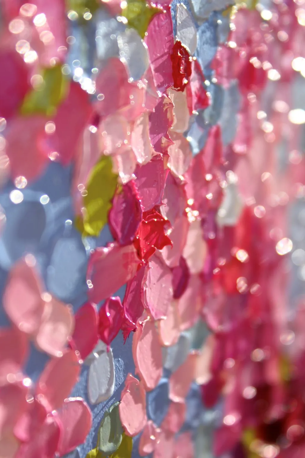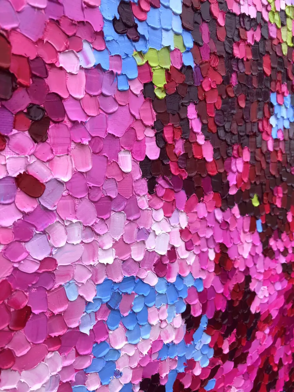 Ulyana Korol, known for her masterful palette knife technique, uses vibrant pinks, blues, and subtle greens to craft a scene that exudes romance and joy. The textured strokes give life to every petal, making the artwork almost tangible and deeply immersive.