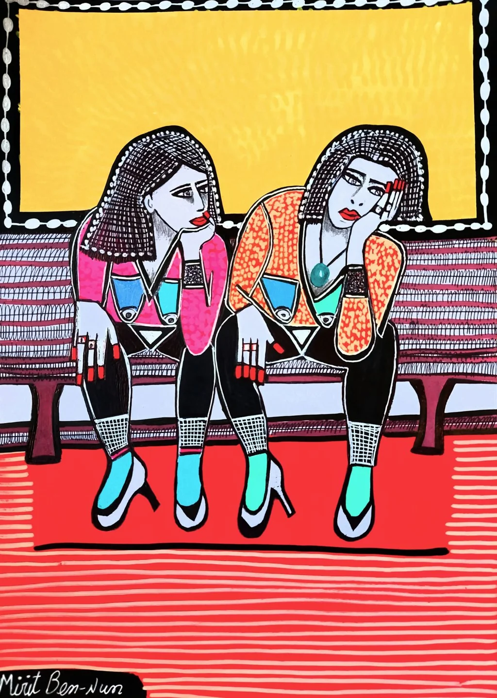 Mirit Ben Nun, a celebrated Israeli artist, is known for her bold and vivid storytelling through colors and patterns. Two Girls on a Bench is a striking example of her ability to transform everyday moments into powerful visual narratives, making it a must-have for those who appreciate expressive and deeply emotive art.