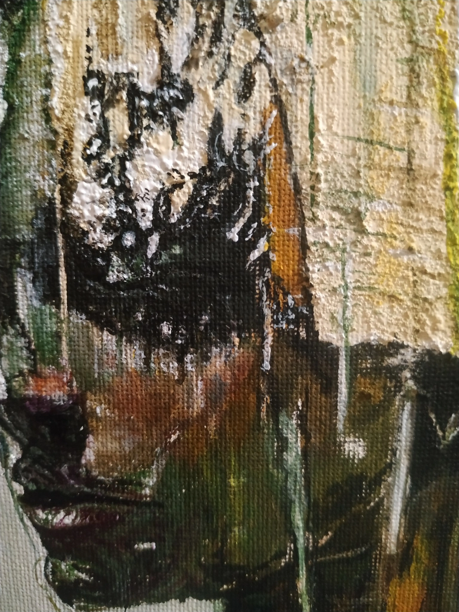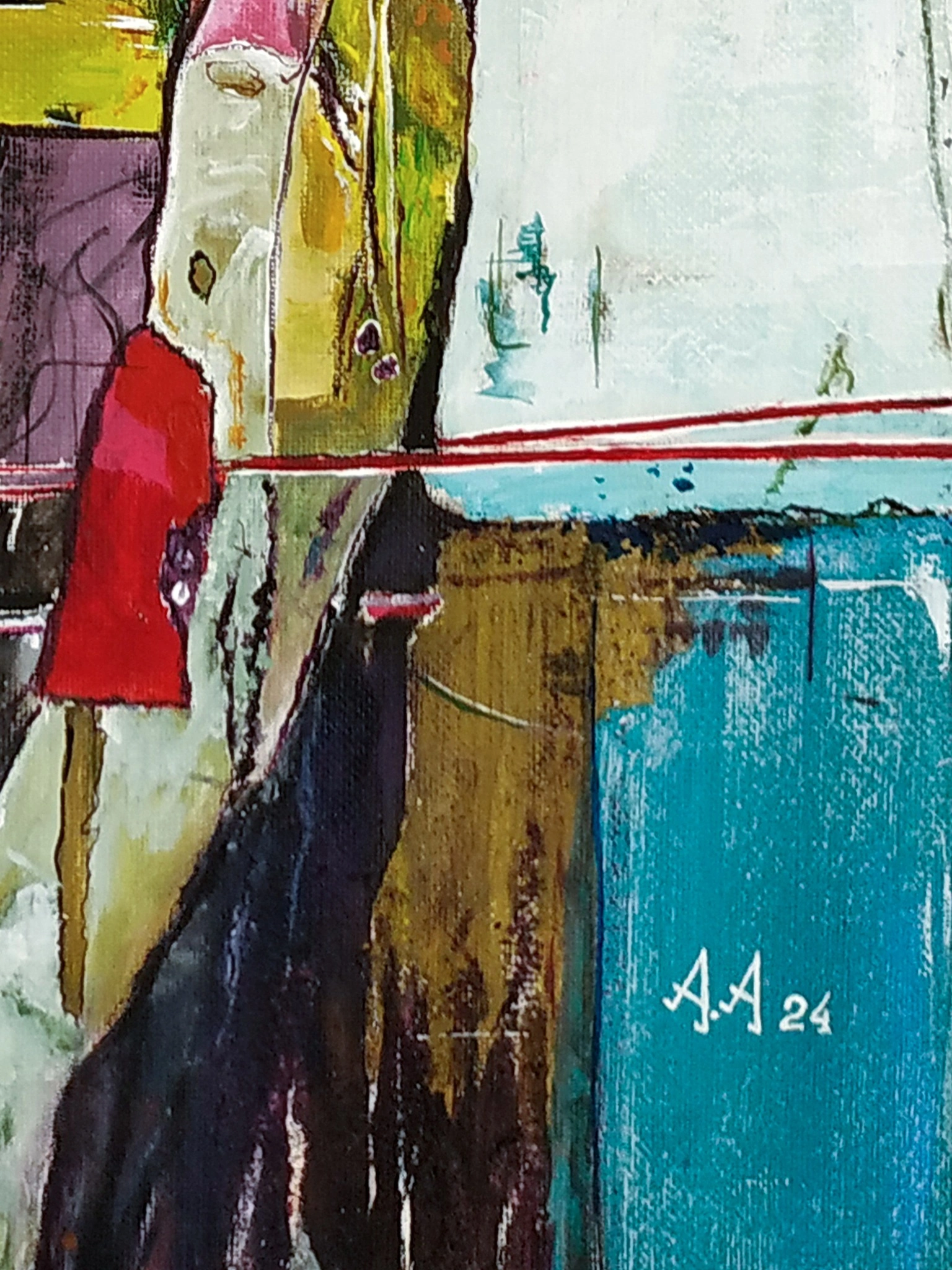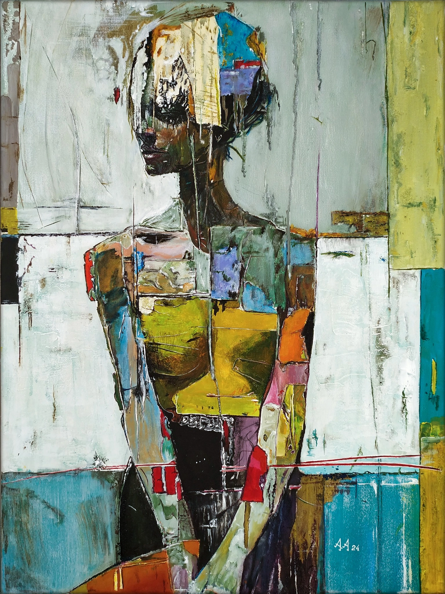 In “Unfamiliar Score of Notes,” the artist weaves together abstraction and figuration to form a hauntingly introspective portrait. Composed in acrylic on canvas, the painting blends muted, earthy tones with sharp color blocks and fragmented geometry, evoking a rhythm as elusive as a forgotten melody. The obscured face, dissolving into layered textures, invites reflection and a sense of longing, like deciphering a deeply personal memory. With its contemplative and serene atmosphere, this work suits introspective spaces such as a study, library, or guest room.