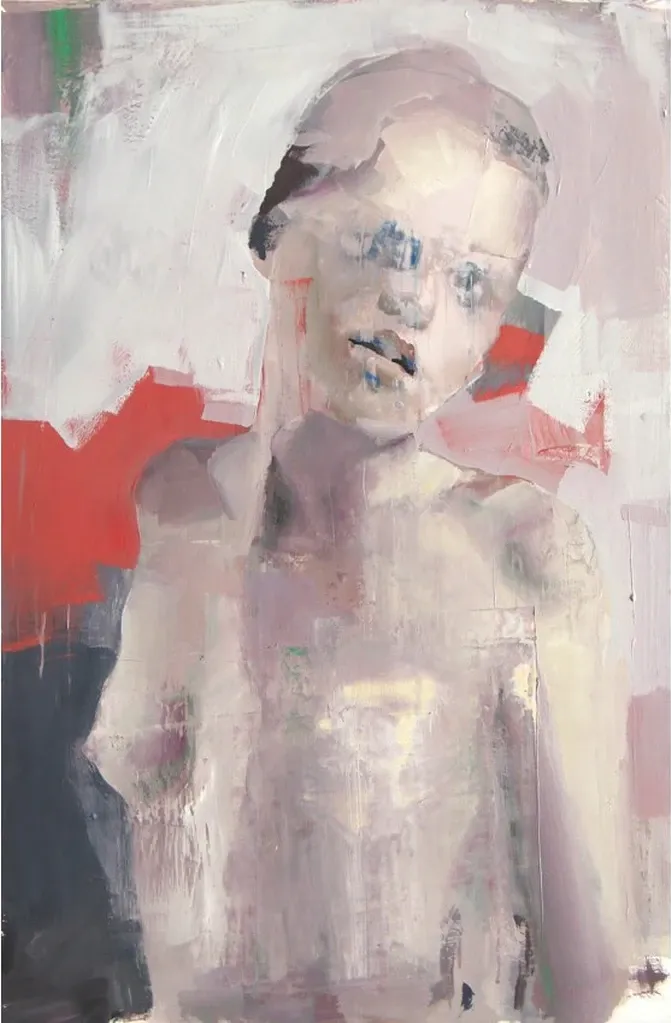 The muted pastel palette, contrasted by bold red and black strokes, adds an intense yet delicate aura to the painting. The subject's blurred features and fluid brushwork create a dreamlike atmosphere, drawing the viewer into a state of introspection.