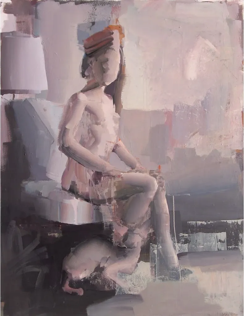 The composition portrays a seated figure with a fragmented and textured form, inviting the viewer into a contemplative space.