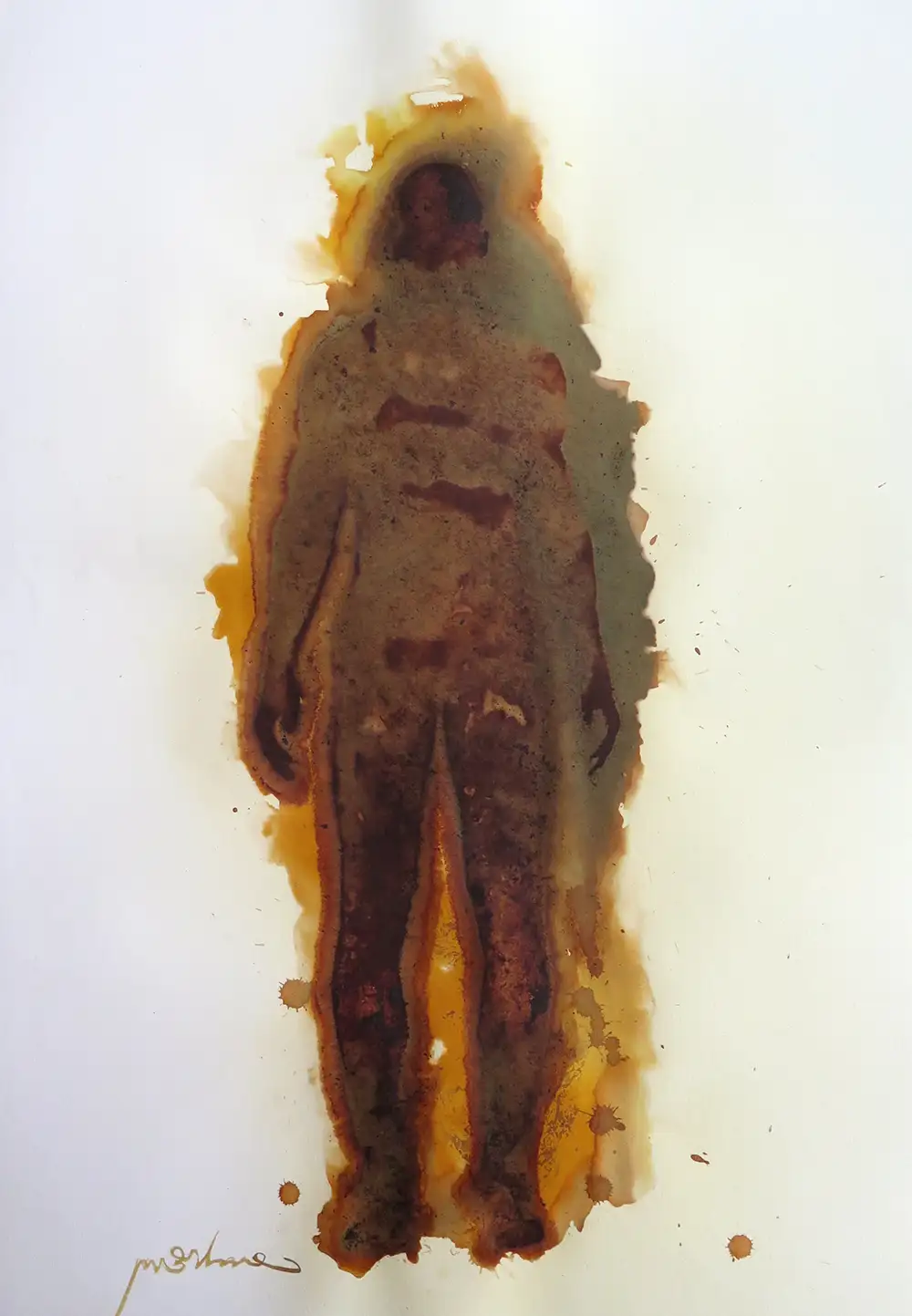 A shadowy figure enveloped in vibrant rust and amber tones, suggesting a dynamic interplay between existence and erosion, life and decay.