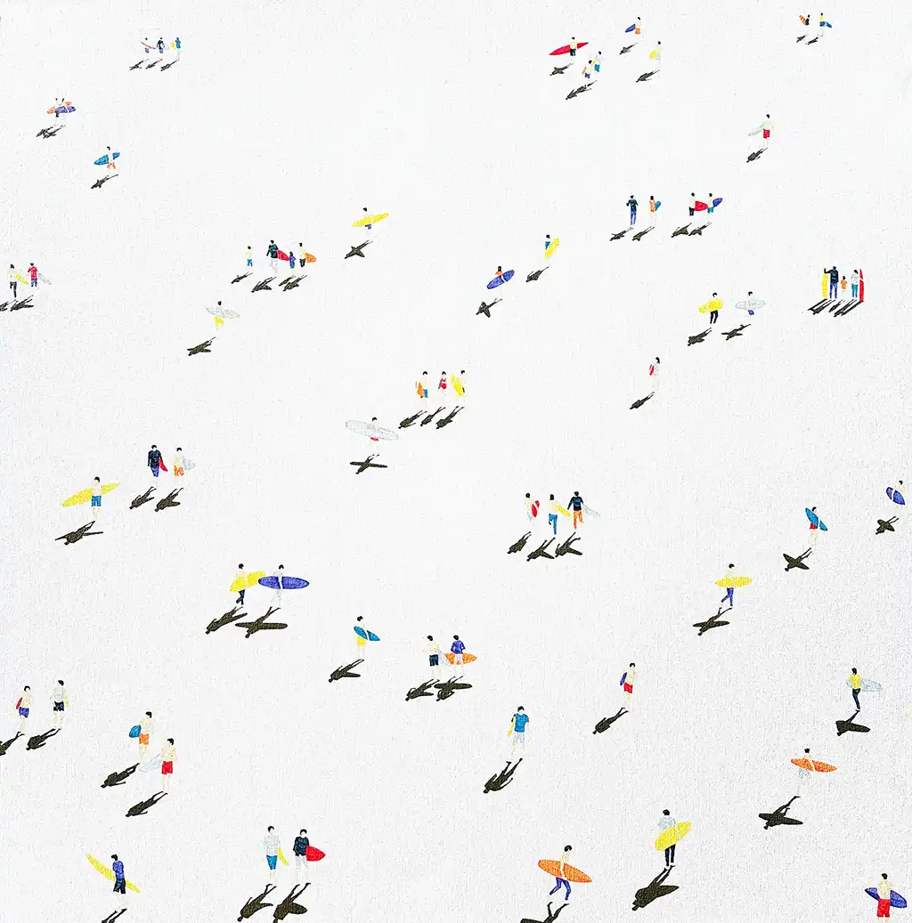 Painted in 2023, this oil on canvas artwork measures 100 x 100 x 4 cm and features tiny human figures holding surfboards scattered across a stark white background, creating a sense of space and freedom. Ho’s unique style draws attention to the fluidity of life and the delicate interplay between movement and stillness. The minimalist backdrop allows the colorful silhouettes of the surfers to pop, conveying both individuality and a shared communal experience. Each figure is meticulously detailed, their shadows casting a subtle depth against the flat canvas, evoking a sense of calmness and leisure. The painting’s bright and neutral color palette, paired with the lively portrayal of surfers, brings a playful yet relaxed vibe, perfect for uplifting any space. Whether displayed in a living room, office, or recreational area, "Waves 07" is sure to inspire a tranquil and vibrant atmosphere. Ho’s ability to capture the essence of the beach, the anticipation of the waves, and the joy of surfing makes this piece a delightful addition to any art collection.