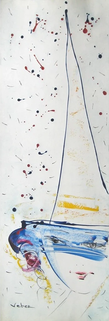 Veber’s signature abstract style transforms the subject into a vision of poised elegance, enhanced by the sharp contrast between light and dark tones. The use of blue and white suggests the crisp chill of winter, while the golden accents bring warmth and a touch of luxury. The subject’s enigmatic gaze adds to the intrigue, inviting the viewer to interpret the story behind the painting.