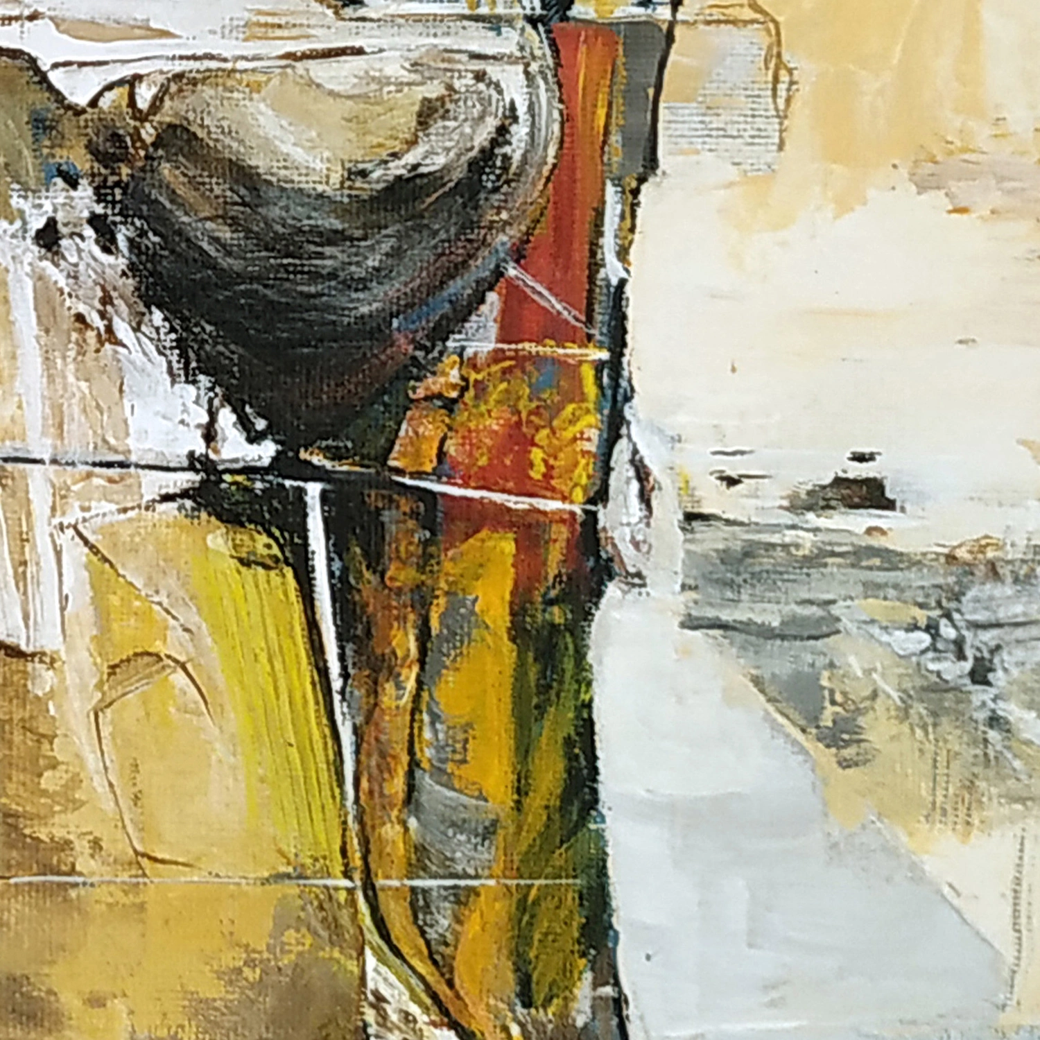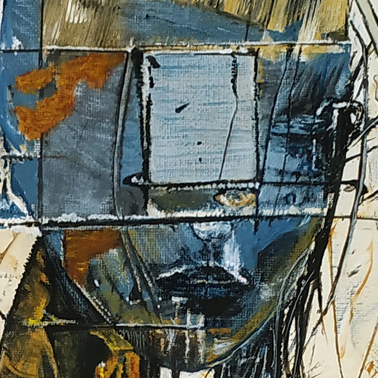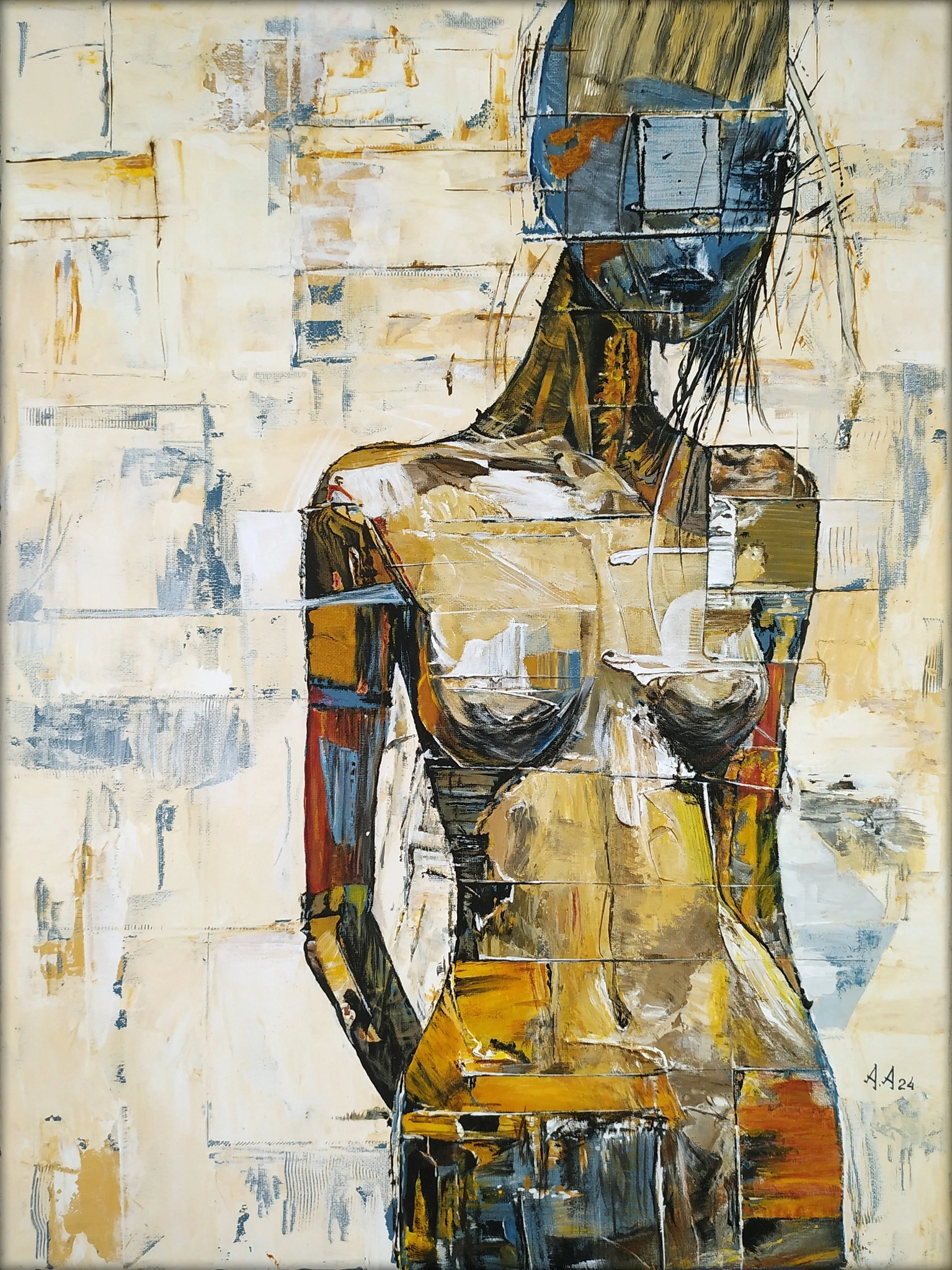 Without any Problems by Alexander Aksyonov is a meditative figurative nude rendered in earthy hues and abstract fragmentation. Painted in acrylic on canvas, the figure stands calmly exposed yet shielded behind softened lines and geometric blocks—inviting quiet reflection on identity and vulnerability. Tones of ochre, gray, and sienna ground the figure in a space of emotional stillness, free from noise or urgency. This intimate, raw, and contemplative work is ideal for personal spaces like a bedroom, study, or library.