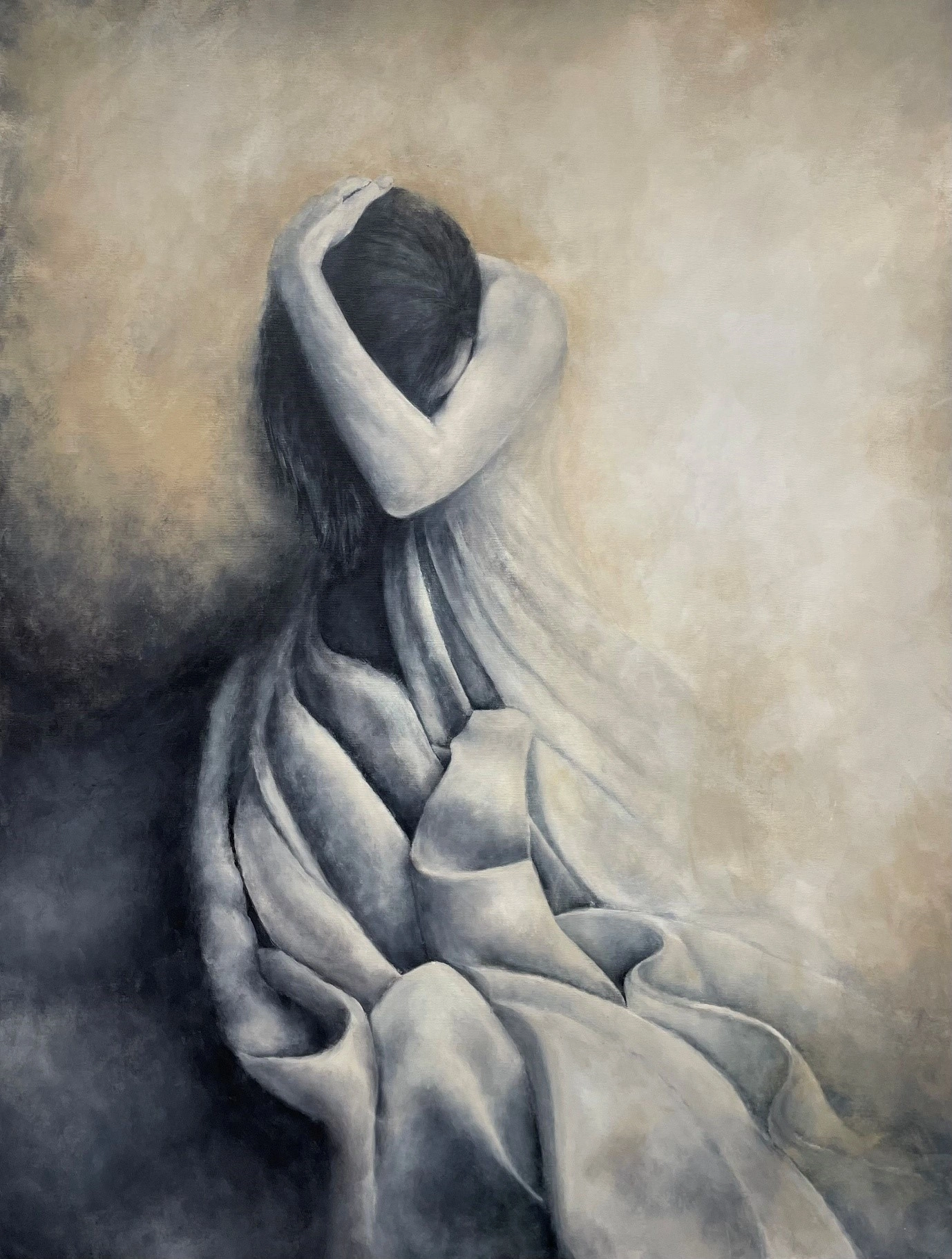 This figurative acrylic painting shows a quiet, seated woman in soft folds of fabric, surrounded by gentle tones and a tender, reflective atmosphere.