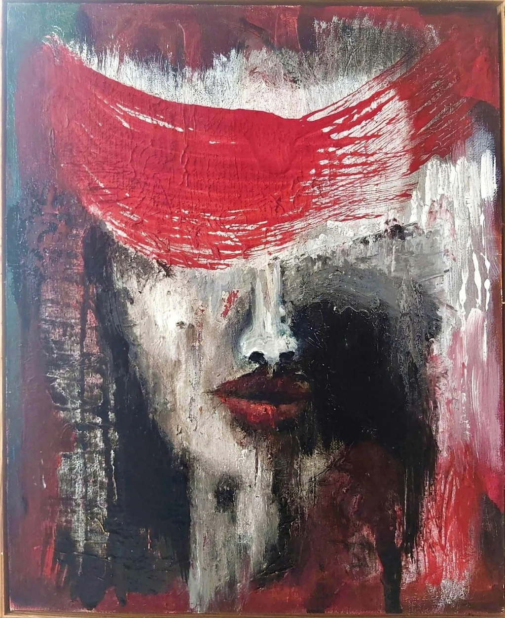 The focal point of the piece is the woman's face, partially obscured by a bold, sweeping red mark—symbolic of emotion, identity, or perhaps an untold story. Her lips, accentuated in deep red, add to the intensity of her presence, while the heavy impasto technique brings a tactile, almost sculptural quality to the composition. The background’s abstract elements enhance the sense of movement, reinforcing the painting’s dramatic energy.