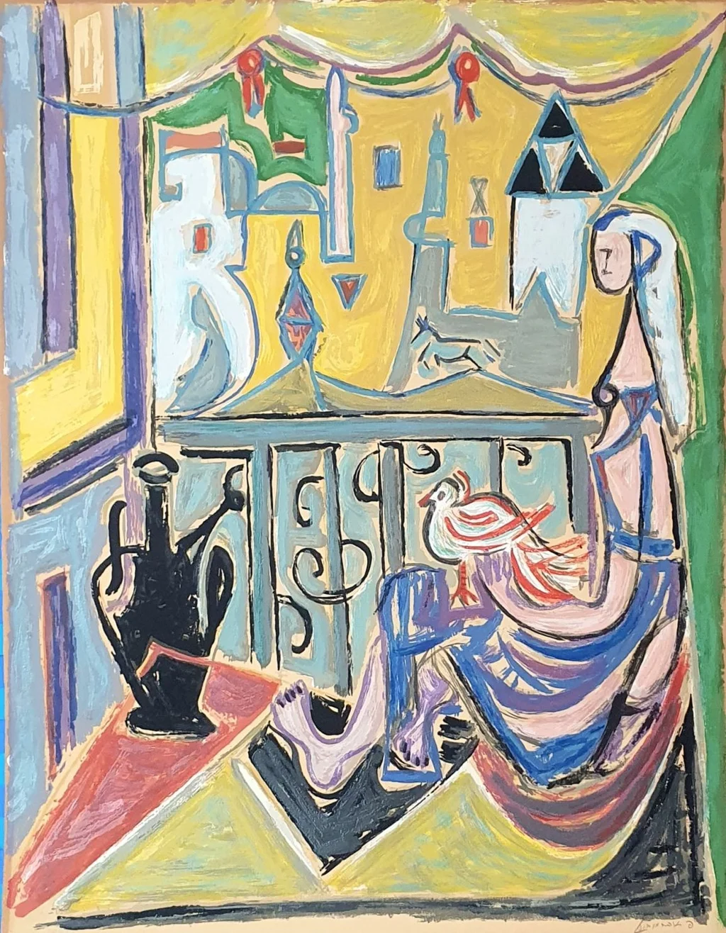 The central figure, a seated woman, appears in a moment of contemplation, surrounded by architectural forms, vibrant drapery, and symbolic imagery. The stylized objects—such as the decorative vase and perched bird—add an air of mystery, inviting viewers to interpret the deeper meaning behind the composition.