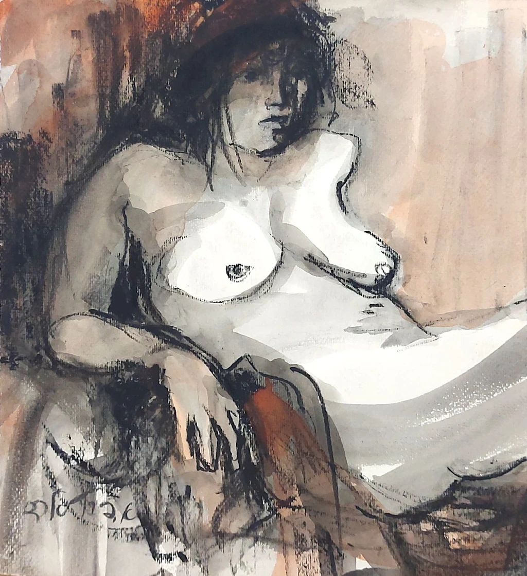 The figure, outlined in gestural black ink, appears both lost in thought and deeply present, her gaze turned away yet filled with silent expression. The use of earthy browns and soft grays provides warmth and depth, contrasting with the stark white of the paper to highlight the body’s natural curves and textures.