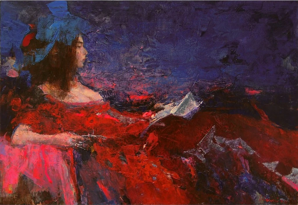 A captivating fusion of figurative and expressionist art, Writer by Serhiy Reznichenko portrays a woman immersed in the world of literature.