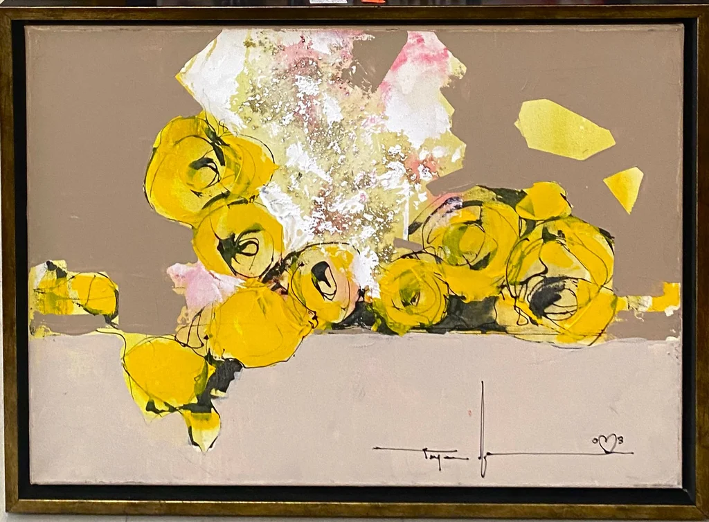 A delicate and expressive acrylic painting of vibrant yellow flowers by Mugur Popa