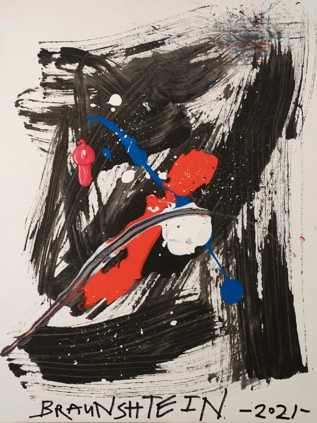 Measuring 30 cm by 40 cm, the artwork features dynamic strokes of red, blue, and white layered over a dramatic monochrome background. Braunstein’s use of spontaneous brushstrokes and raw textures reflects his commitment to artistic freedom and unapologetic self-expression.