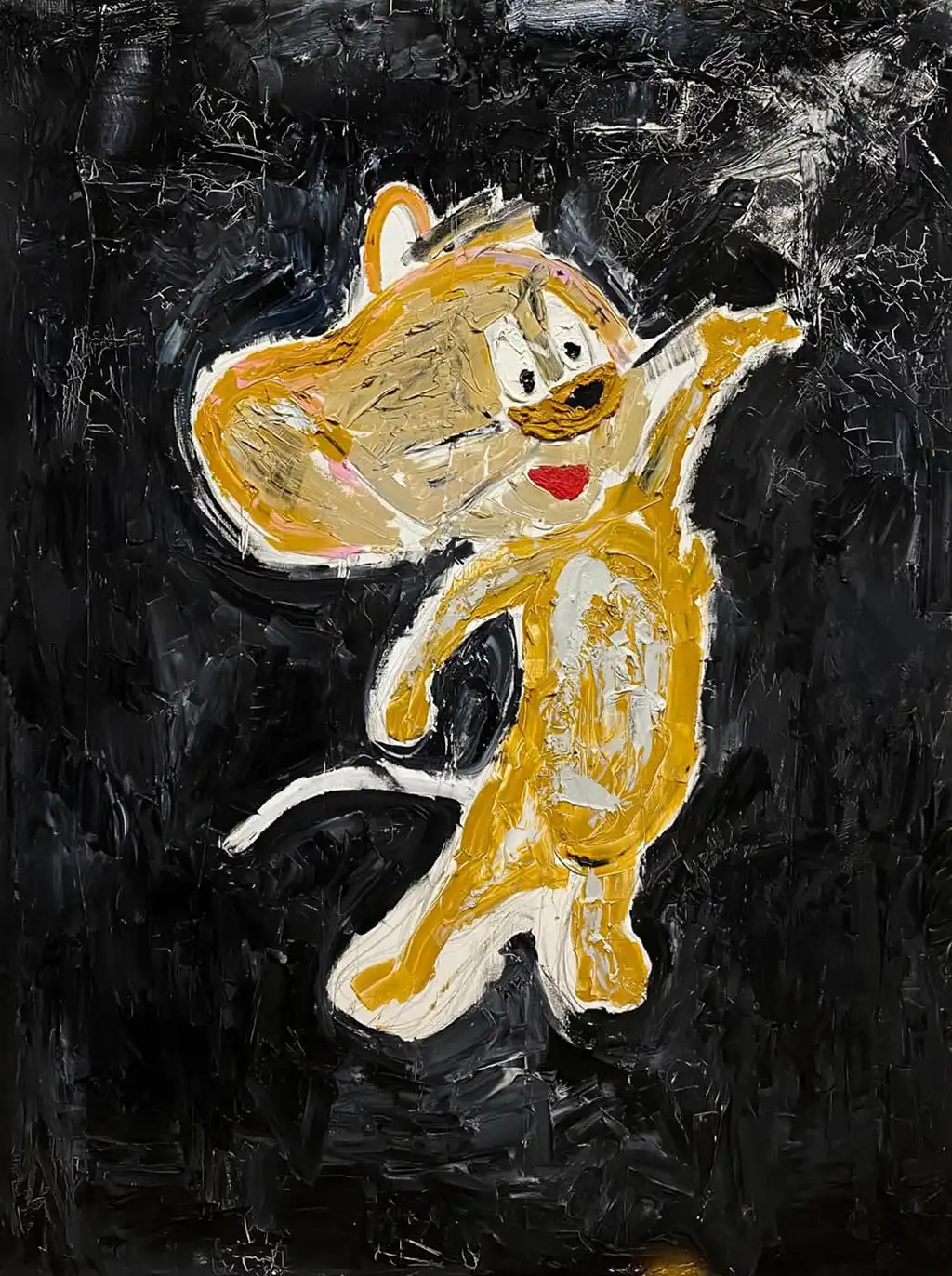 Measuring 120 x 160 cm, this oil on canvas piece brings the beloved cartoon character Jerry Mouse to life in a dramatic, dark background. The vivid contrast between the character's vibrant yellow and brown hues against the almost black backdrop enhances its dynamic energy, making it an eye-catching centerpiece for any space. Ilan Halfon, known for integrating pop culture icons into his artworks, presents "Yessss" as a testament to his unique style. The piece is filled with whimsical charm and a touch of humor, capturing the mischievous spirit of the character in a moment of triumph. The expressive brushstrokes and textured application of paint add depth and movement, as if Jerry is about to leap off the canvas with excitement. This artwork is not just a visual delight but also evokes a sense of nostalgia and joy, transporting viewers back to carefree childhood days. It is perfect for a variety of settings, from living rooms and entertainment areas to game rooms and youth spaces, where its vibrant personality can truly shine. Whether you are an art enthusiast or a pop culture aficionado, "Yessss" will undoubtedly make a statement, bringing a playful yet bold atmosphere to your decor. Its expressive style and familiar subject matter offer a fresh, contemporary take on a classic character, making it a must-have for collectors who appreciate the fusion of art and nostalgia.