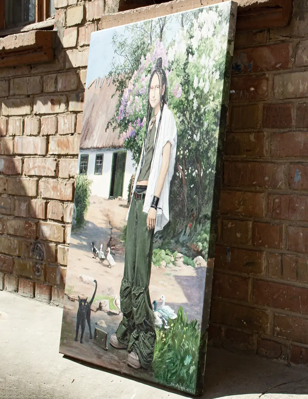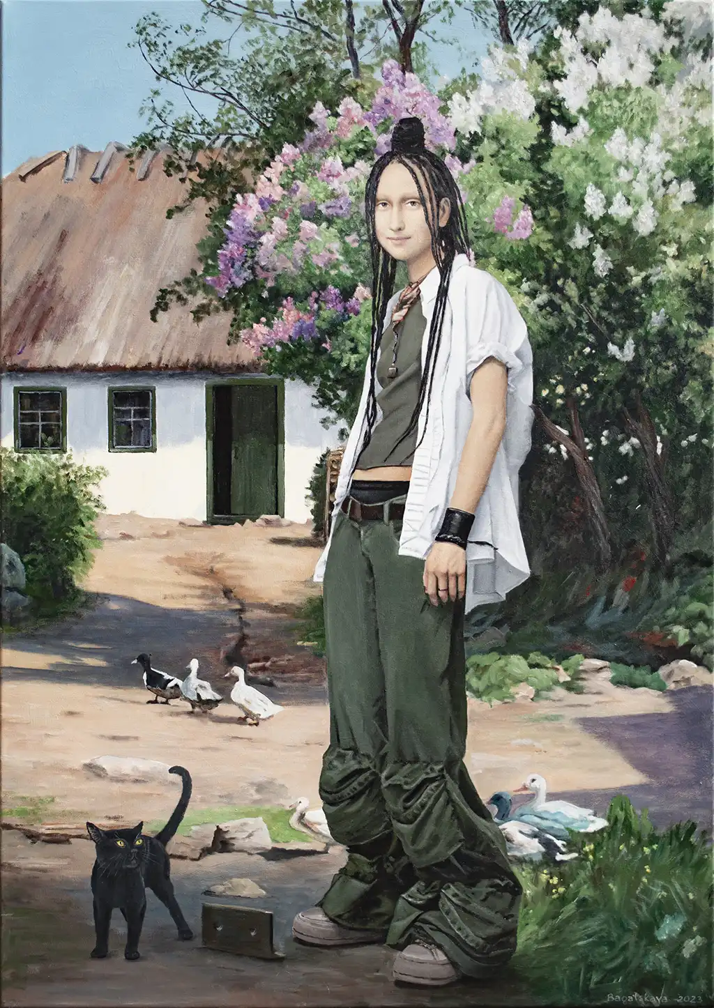 The central figure, a young woman, embodies a modern yet timeless essence as she stands amidst a charming rural landscape. The idyllic setting, complete with a quaint house, blooming lilac trees, and a procession of ducks, exudes nostalgia and warmth. The intricate details, from the folds of her outfit to the shadows cast by the sunlight, reflect Nataliya's mastery in realism and hyperrealism.