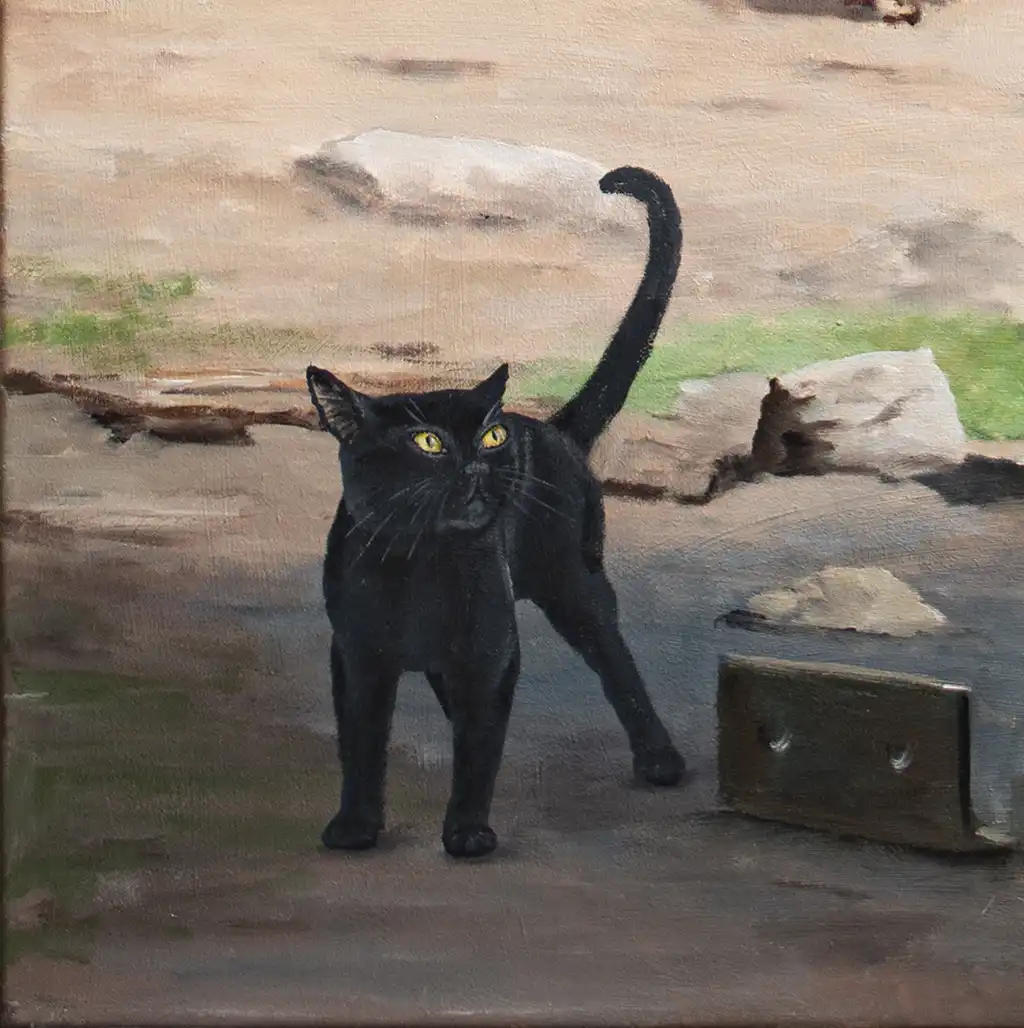 The artist, using Amsterdam™ acrylic paints on Unico™ cotton canvas, brings the scene to life with vivid greens, soft lilacs, and earthy tones, contrasted by the deep black accents of a curious cat.