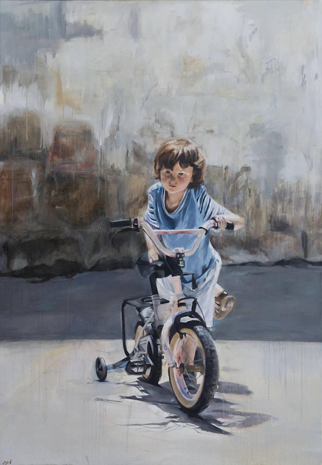 The child, captured in a moment of stillness atop a small bicycle, represents a universal theme of growth, learning, and persistence. The subtle interplay of light and shadow adds depth to the painting, enhancing the contemplative and introspective nature of the composition.