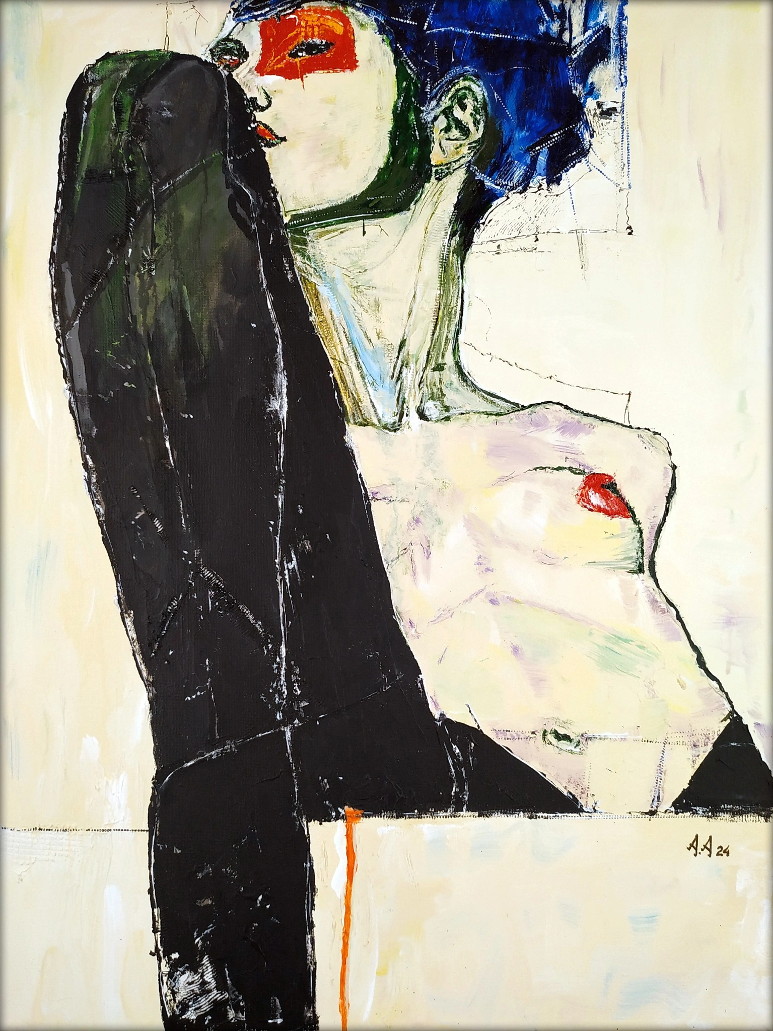 Behind the Mask unravels the tension between what we show and what we conceal. Aksyonov’s subject peeks from behind a raised leg, her face painted in theatrical strokes of red and green, suggesting transformation or defense. Her exposed torso contrasts the guarded pose, revealing both intimacy and distance. The composition plays with bold verticals and dramatic negative space, creating a sense of visual suspense. It’s a portrait of dualities—bold and secretive, raw and performative.